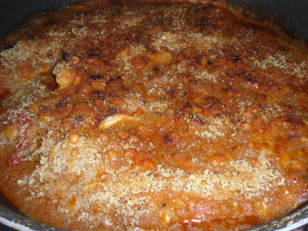 - Num tabuleiro, meter metade da mistura, os filetes por cima, e o resto da cebolada, meter um pouco de pão ralado e levar ao forno.