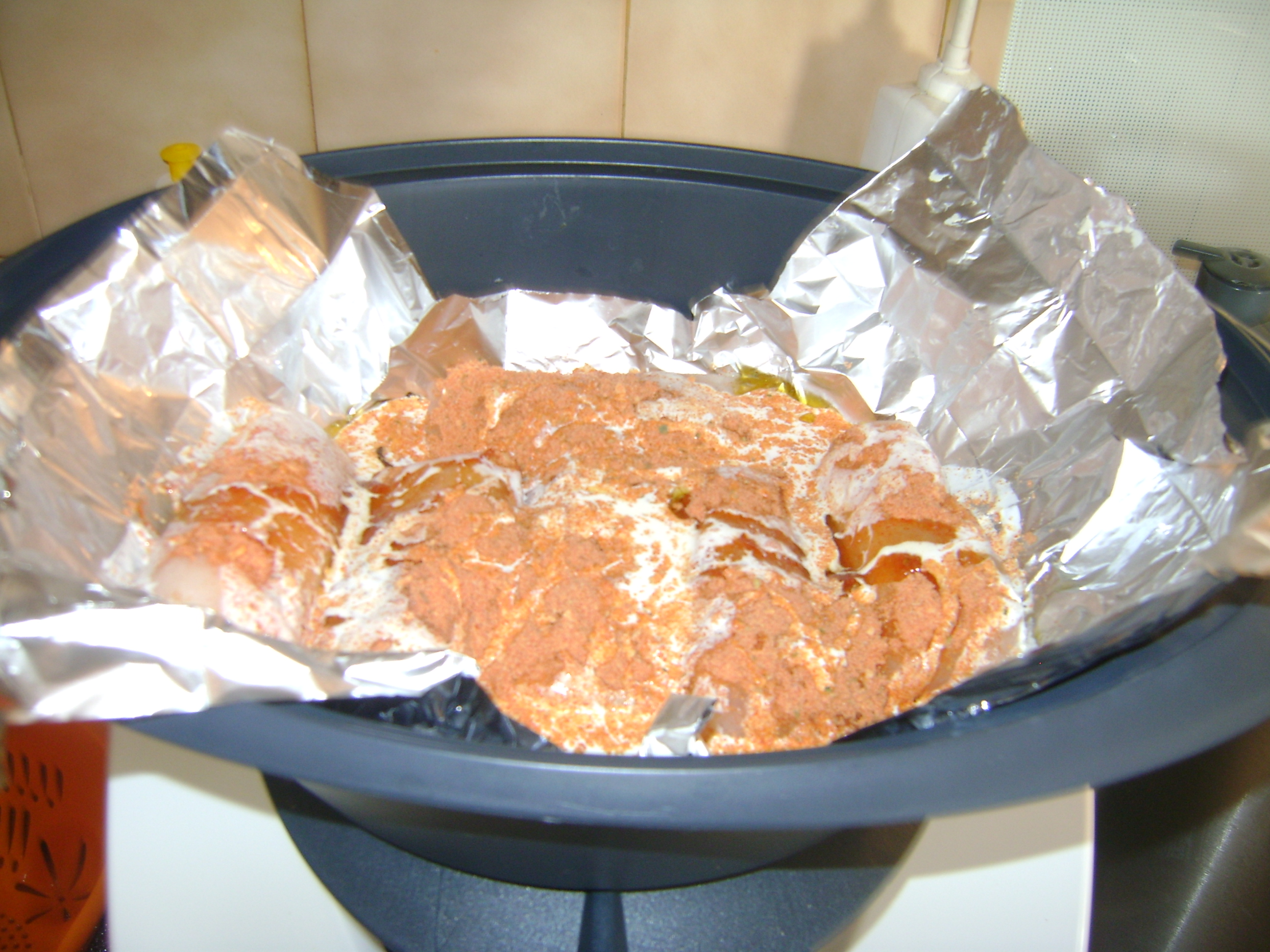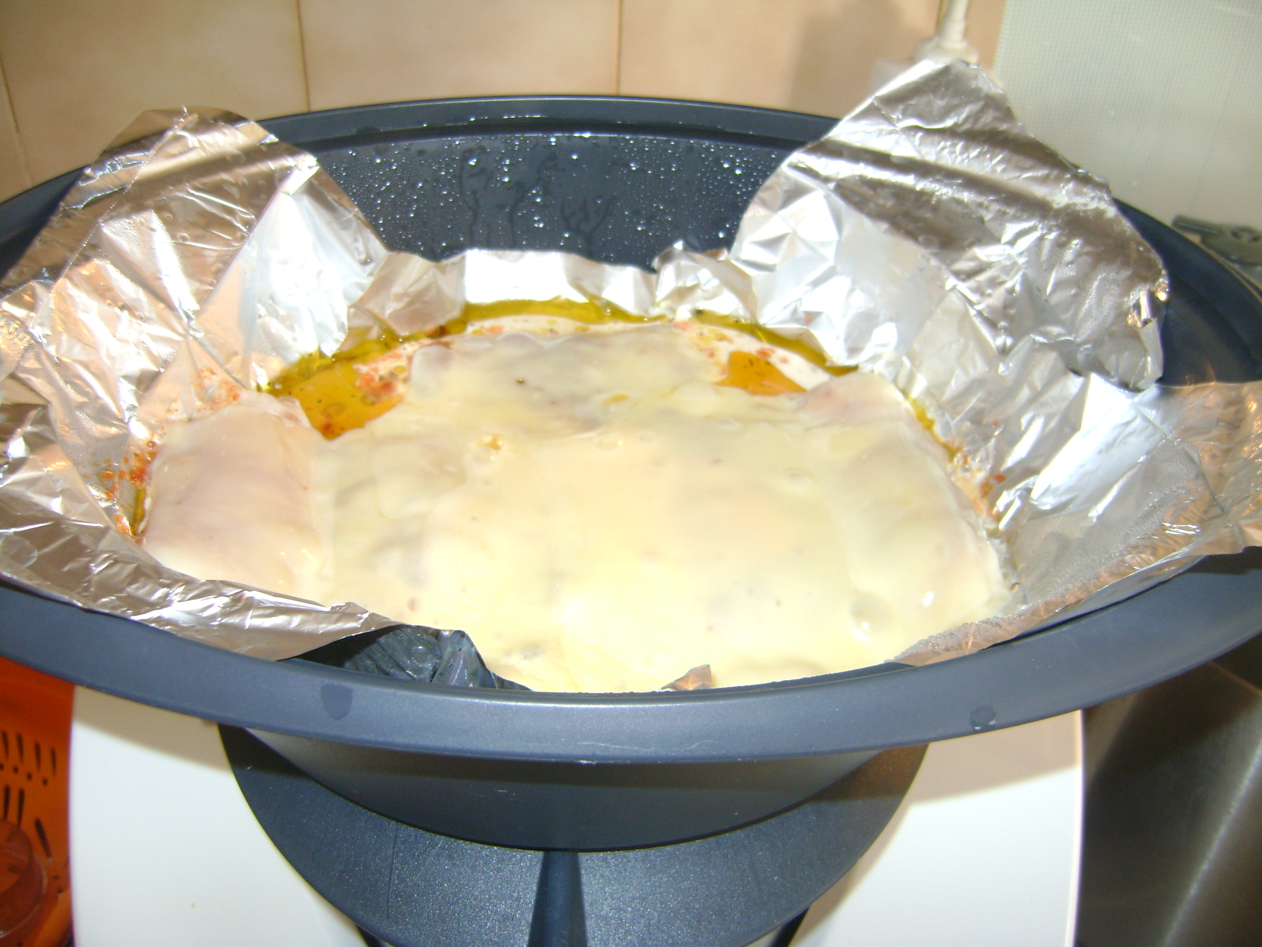 - os lobos de peixe tempero com o sal,o pimento oicado a massa pimentão o azeite