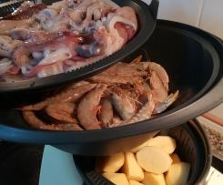 - No copo, colocar a água e um fio de azeite. Introduzir o cesto com as batatas e montar a varoma com as lulas e o camarão e programar 30min/temp.varoma/vel.2.