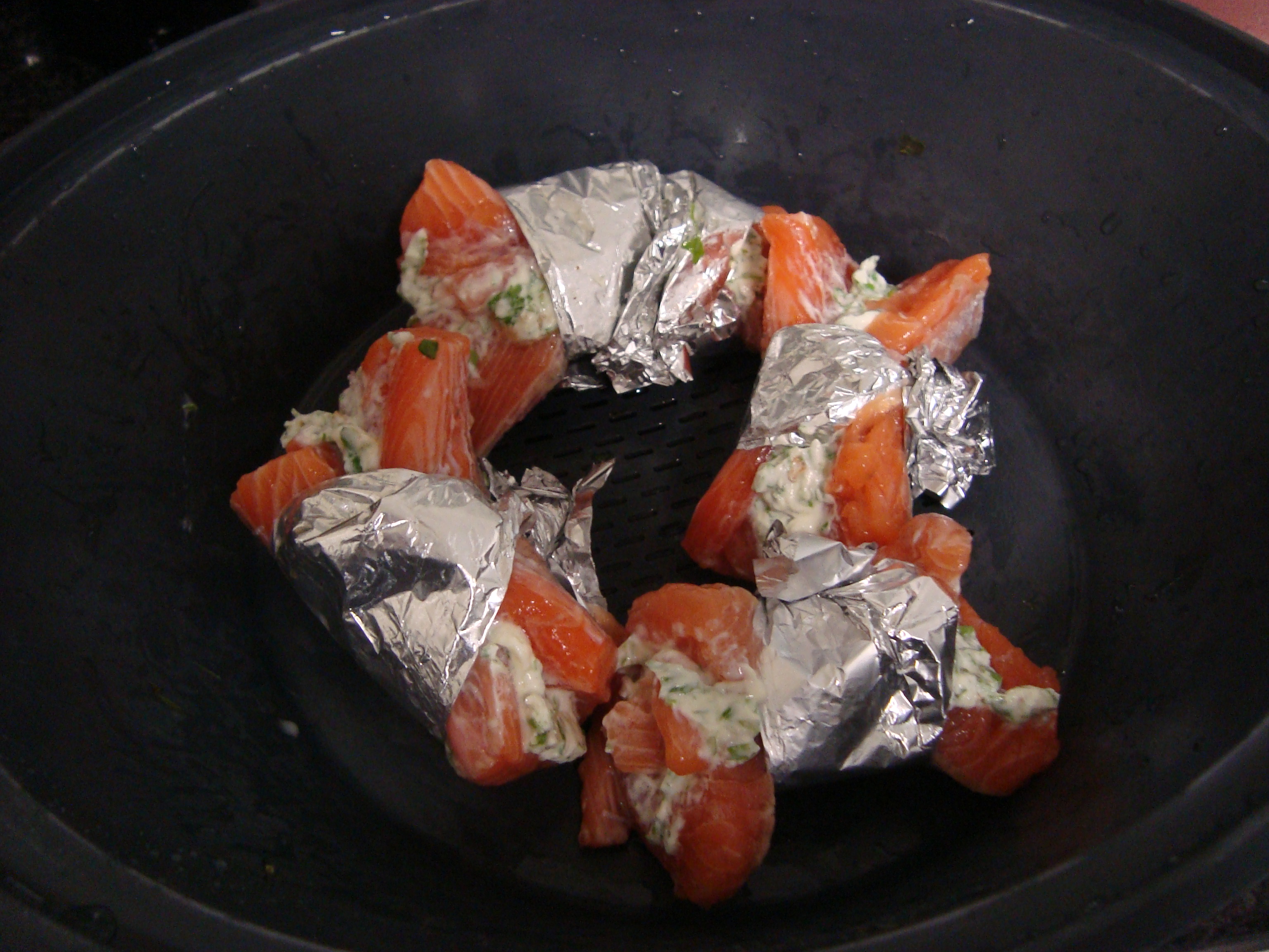 salmão e aperte bem com a ajuda de papel de alumínio. Coloque na Varoma e