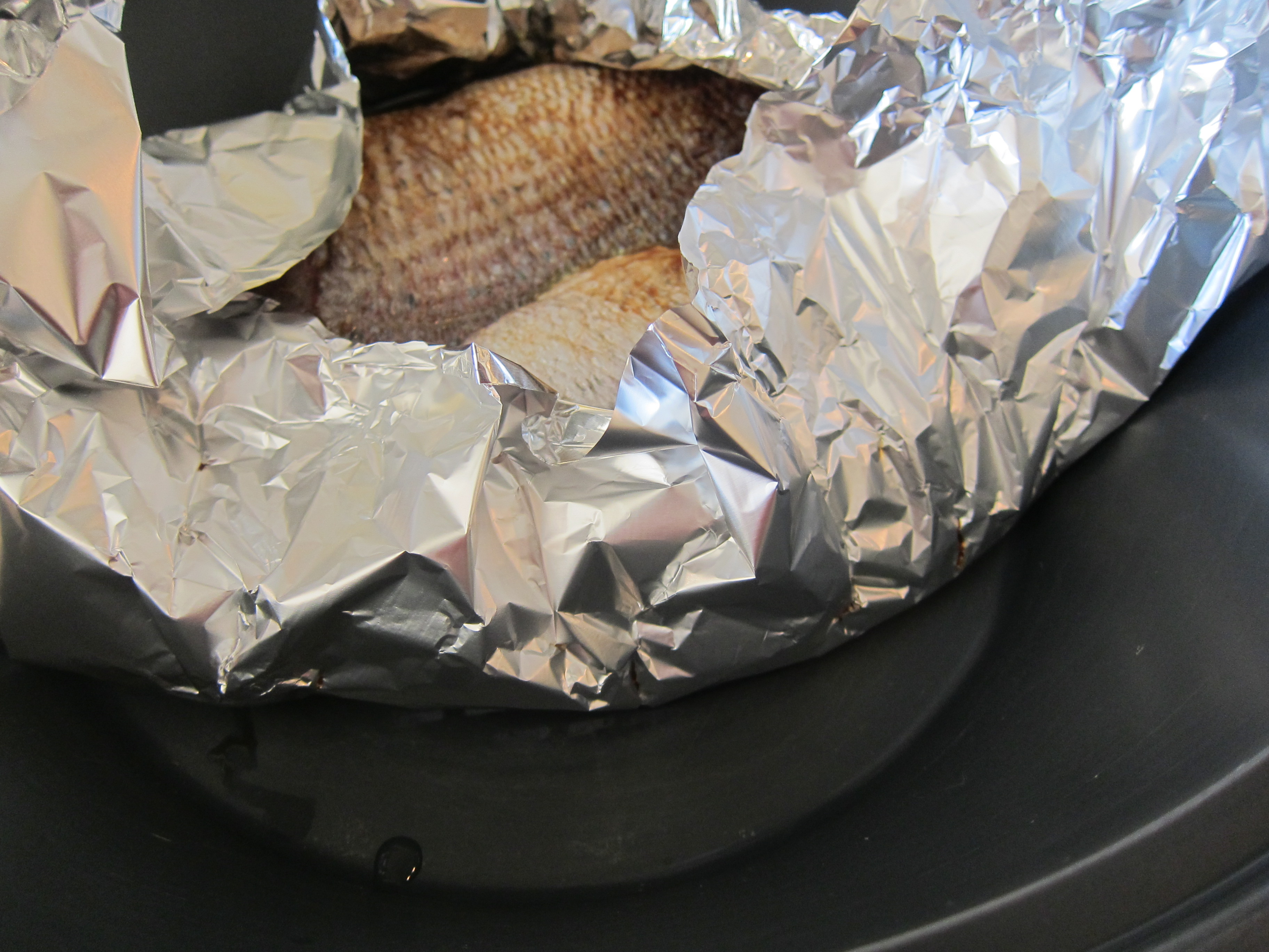 - Dobrar as laterais da folha de alumínio de forma a destapar alguns buracos da Varoma para que o vapor possa circular (ver imagem 2). colocar a varoma, com a tampa, sobre o copo e programar 25 min. Varoma vel. 2; (30 minutos se o peixe estiver gongelado).