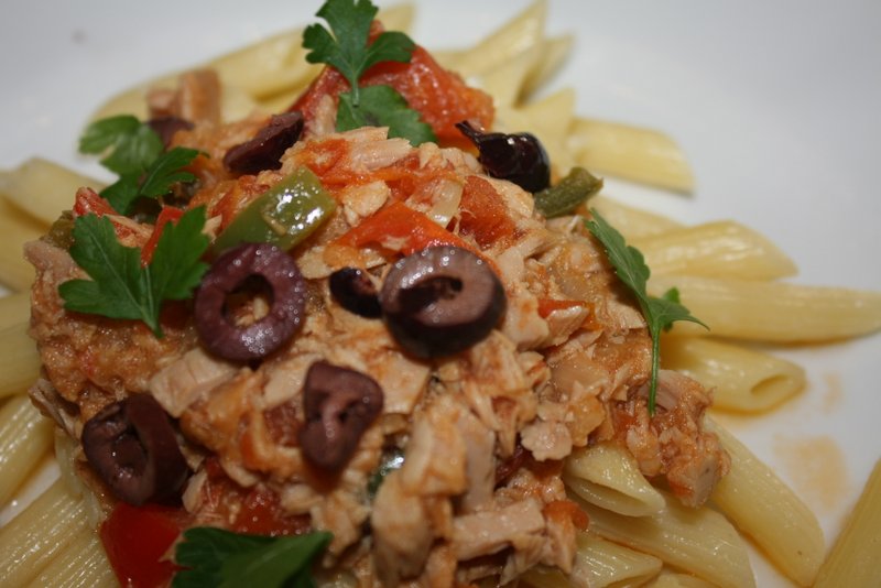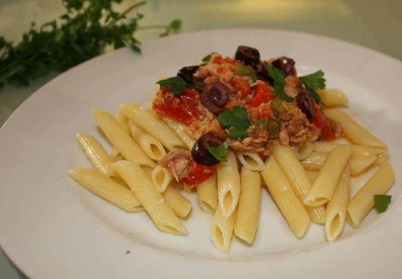 Enquanto a massa coze, aproveite para partir os tomates em cubos não muito pequenos para que não fiquem desfeitos. Corte os pimentos em cubos, retire o caroço às azeitonas e corte-as em rodelas. Corte a salsa em raminhos pequenos. Escorra o azeite às latas de atum.