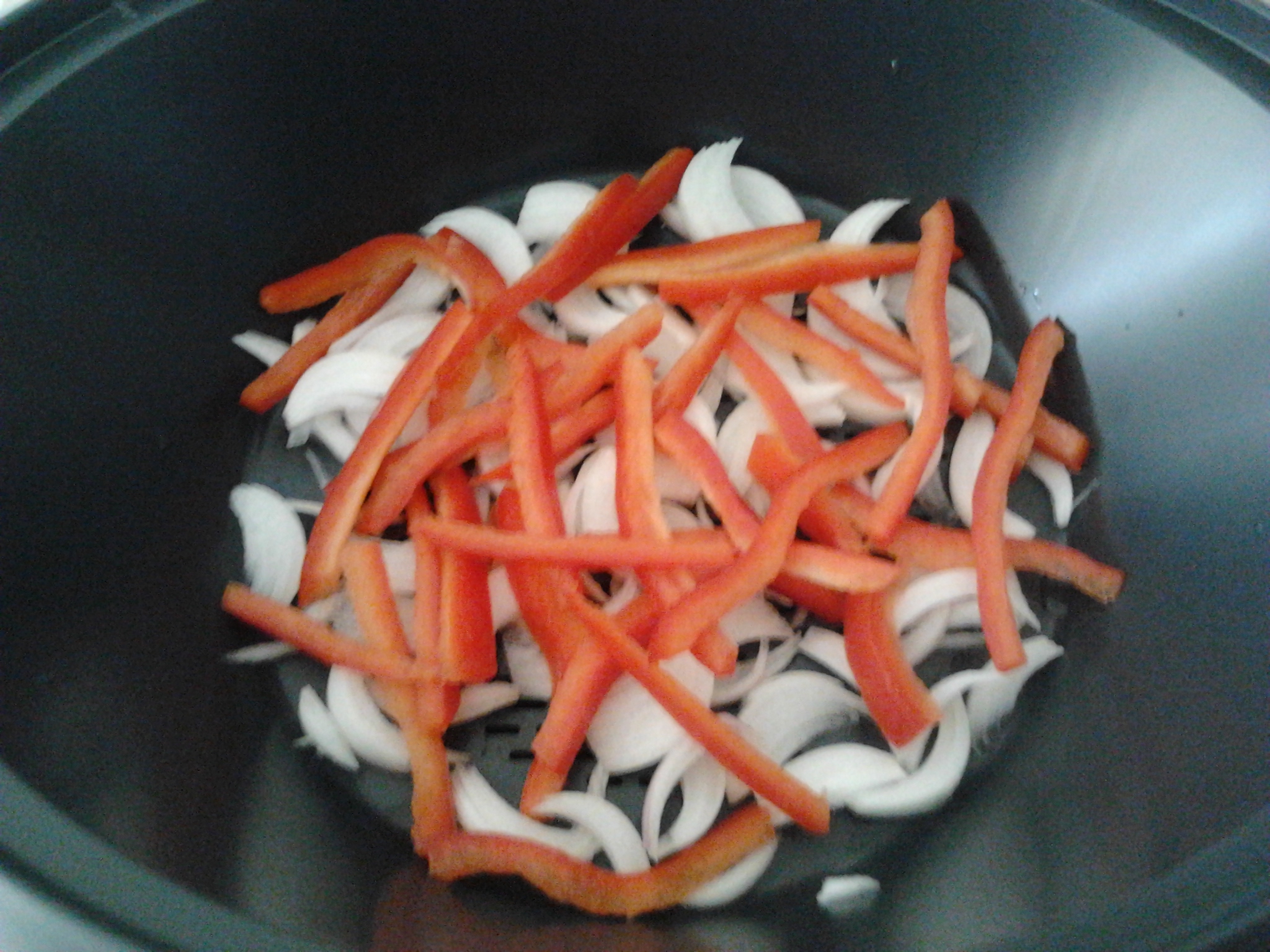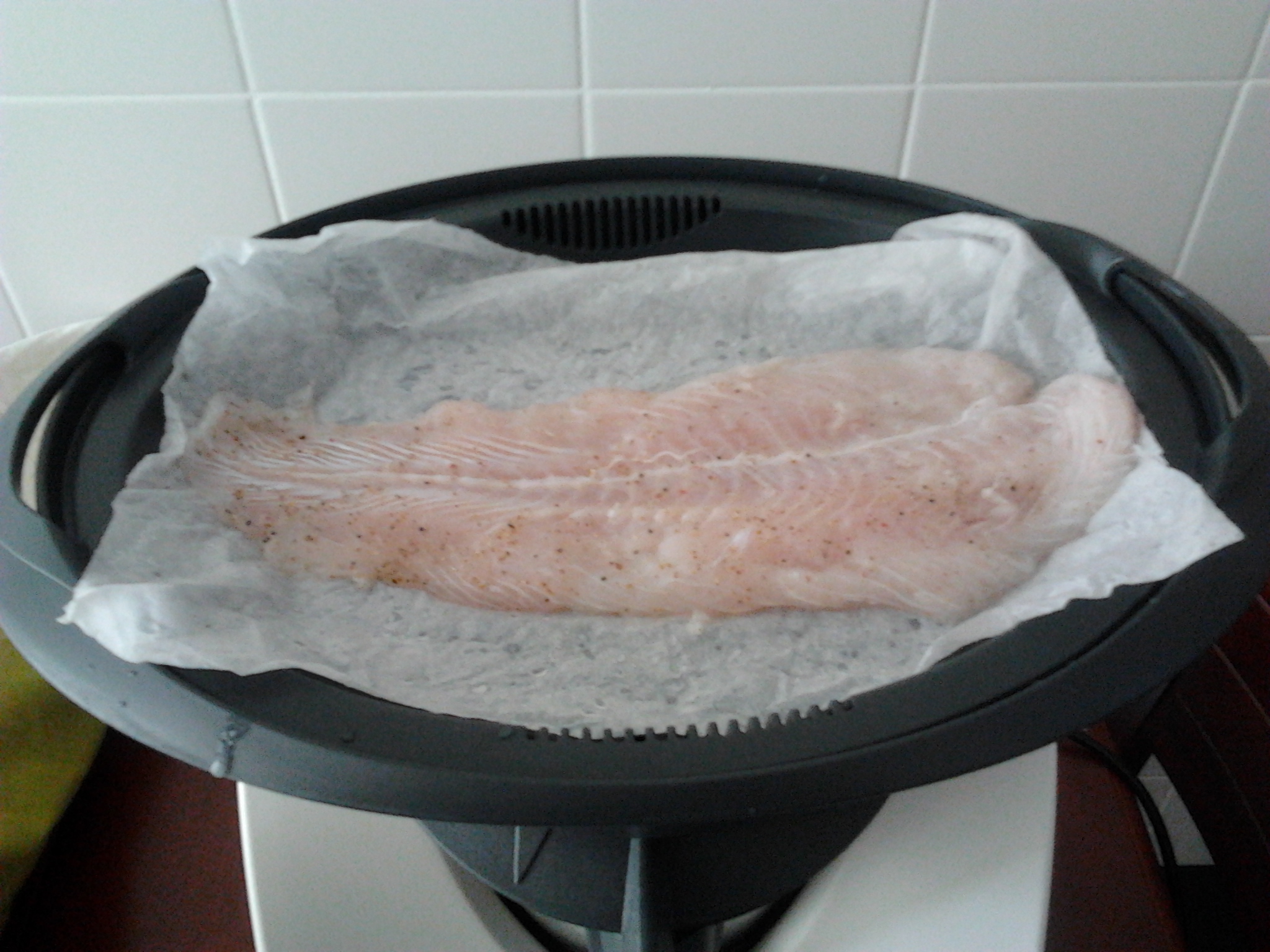 1. Coloque 1500gr de água no copo, introduza as batatas doces com pele e os ovos (Foto 1). Na varoma coloque o pimento e a cebola cortada as tiras, não muito finas (Foto 2). Forre a parte superior da varoma com papel vegetal umedecido, sobre o mesmo coloca-se os filetes de pescada já temperados (Foto 3). 35min/Varoma/colher inversa/Vel.1.