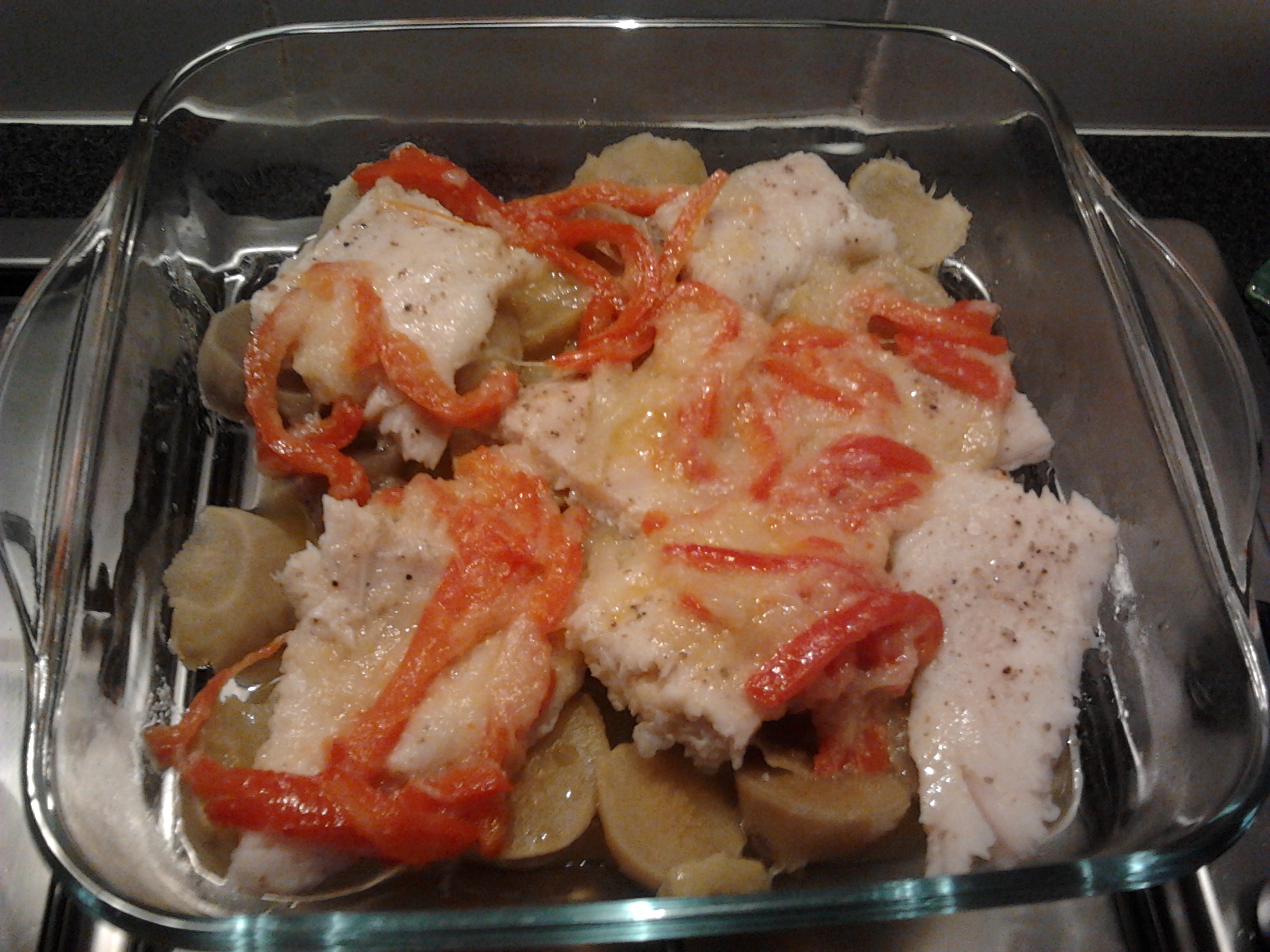 3. Retire a pele às batatas, corte-as em rodelas e coloque -as no fundo do Pirex. coloca-se a pescada cortada aos bocados em cima das batatas. Por cima da pescada, espalha-se o refogado da cebola e pimento. E por último, os ovos cortados às rodelas, as natas e o queijo ralado.