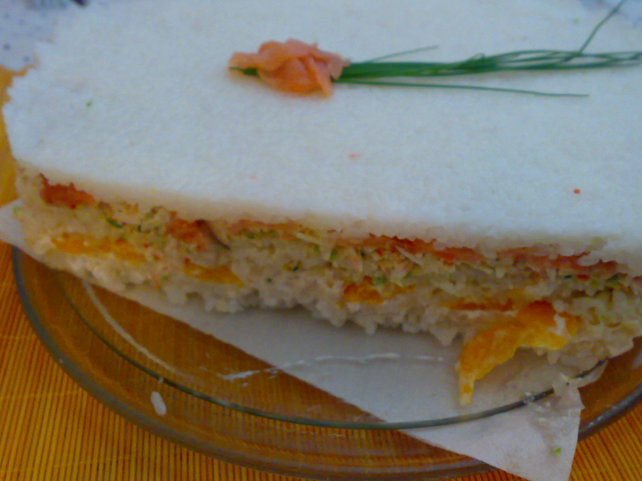 9. Unte com óleo uma forma de fundo amovível. Divida o arroz em 3 partes iguais. Comece por dispor uma camada de arroz no fundo da forma e calque bem. Molhe as mão para que o arroz não se cole. Distribua por cima o queijo creme, depois o pepino e a cobri o abacate. Disponha a segunda porção de arroz, coloque a mistura de delícias e por cima distribua o salmão. Finalize com o restante arroz.
