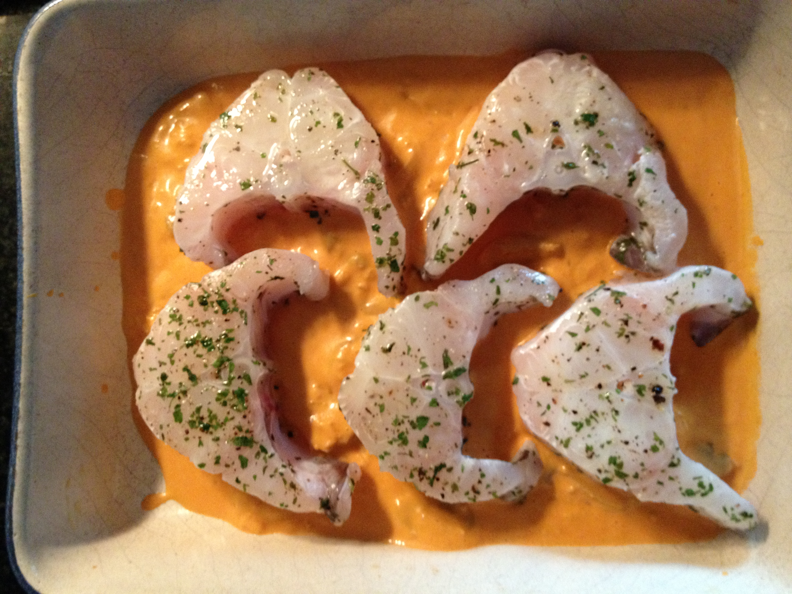 Na travessa que vai ao forno coloca-se um fundo deste molho e pôe-se as postas do tubarão, deitar o restante molho por cima destas e colocar no forno a 200º / 30 min.
