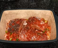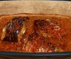 - Colocar o peixe dentro de um pirex ou outro recipiente e deitar a marinada por cima. Envolver com cuidado, tapar e levar ao frigorifico por 12 horas.