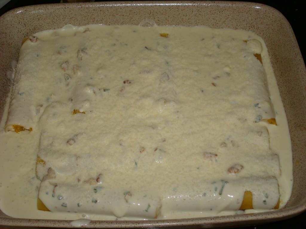 13.  Depois de todos os cannellonis recheados e colocados no tabuleiro, regar com o molho e polvilhar com o queijo parmesão ralado que sobrou.