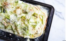 Usando um descascador de legumes, corte as curgetes em tiras fitinhas e espalhe por cima do queijo, cobrindo-o na totalidade.
