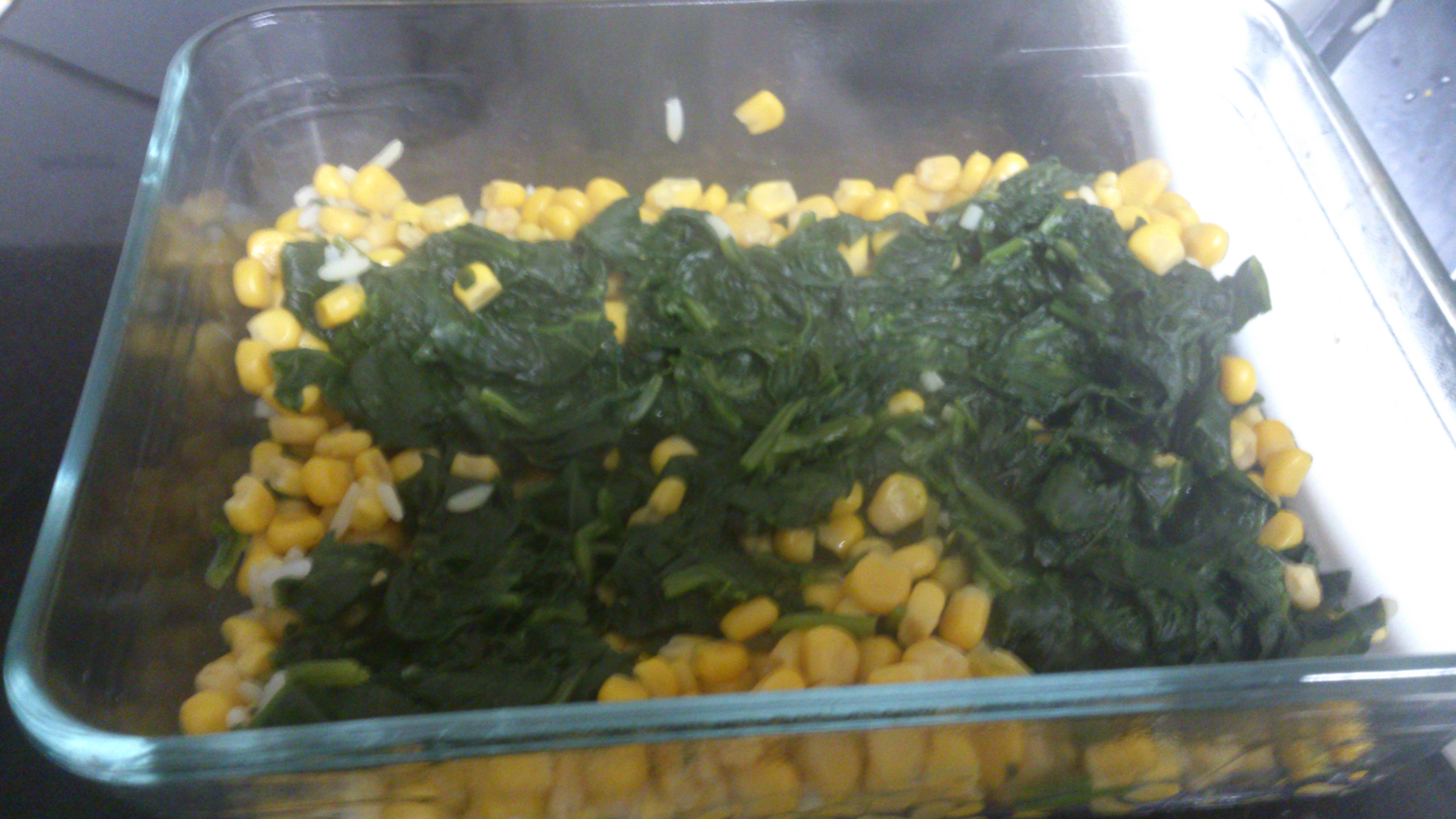 Num pirex dispôr os espinafres e o milho e por cima o preparado do copo.