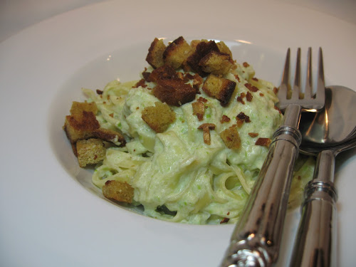 Para servir, envolva o tagliatelle no molho de couve flor e ervilhas, coloque num prato e polvilhe com os croutons e alho.