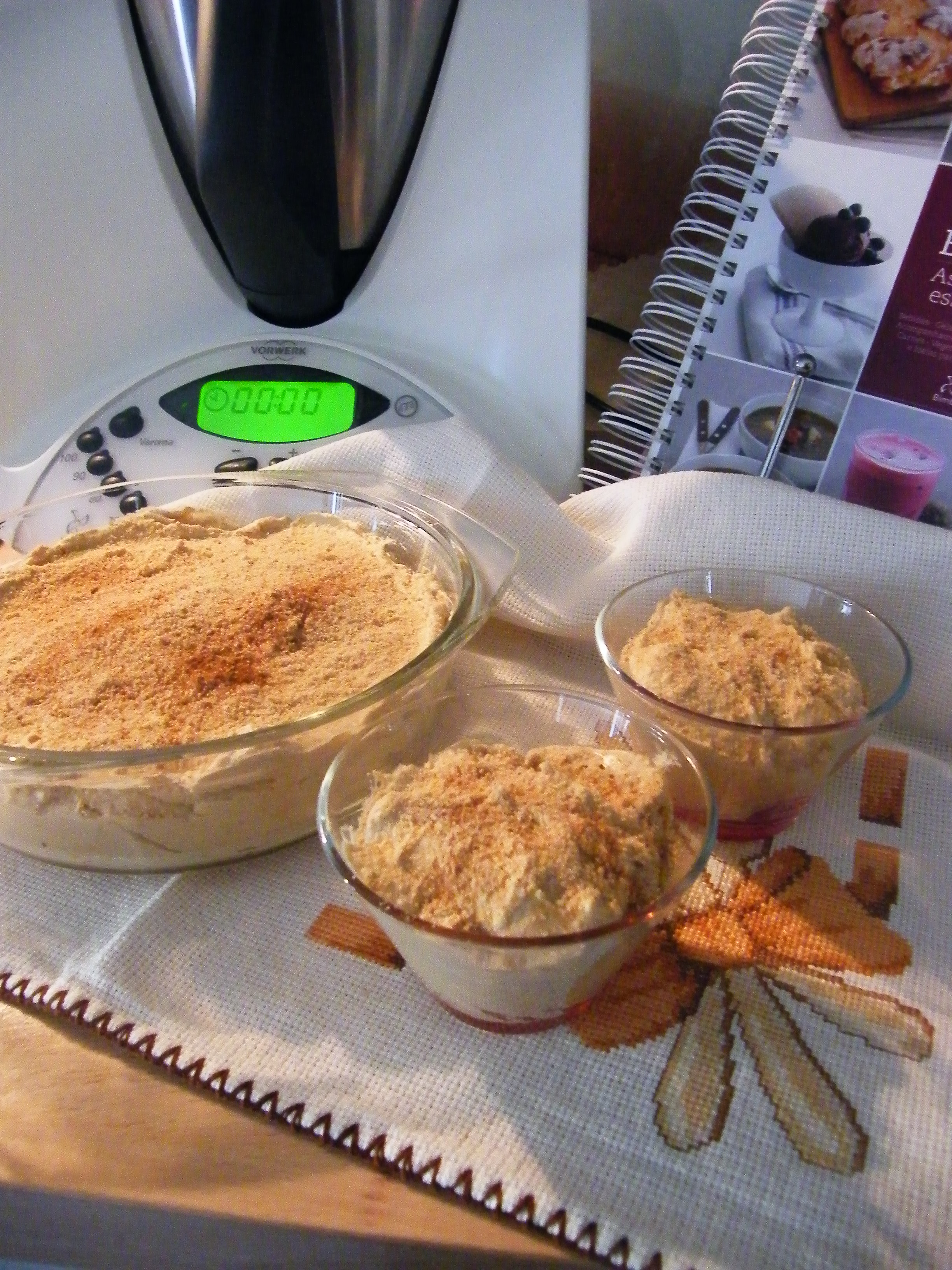 Retirar para uma taça grande ou então para várias pequenas. Polvilhar com canela ou então com bolacha que foi anteriormente reservada.