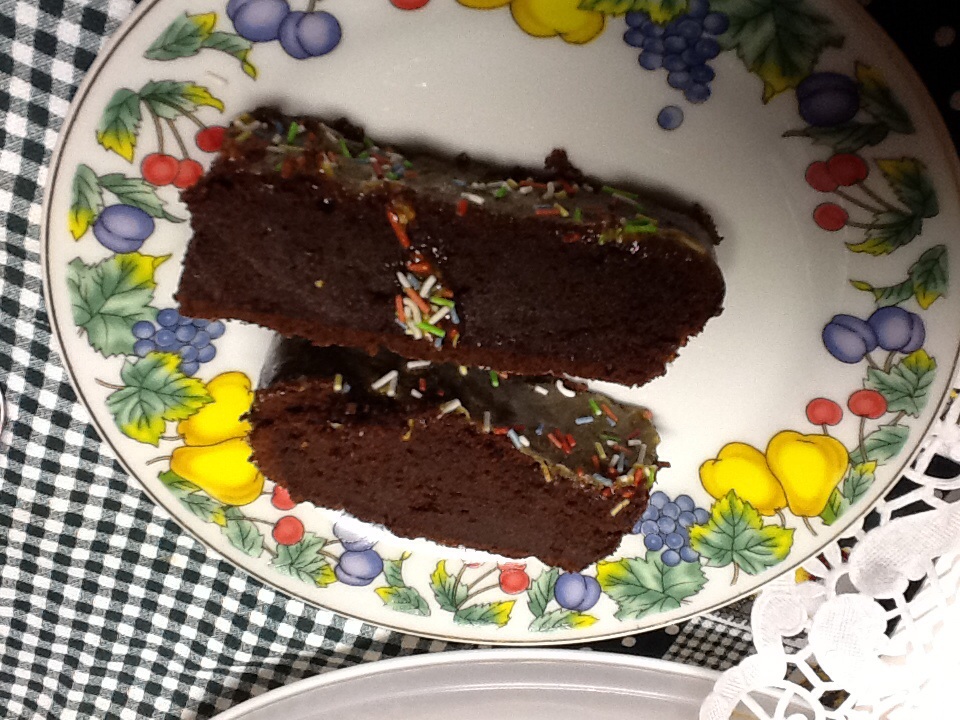 Bolo de cacau e iogurte com cobertura de ovos moles