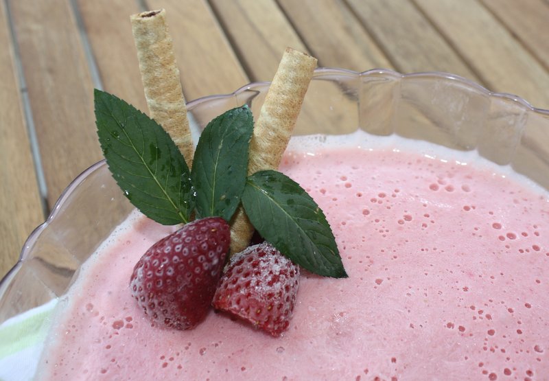Adicione os morangos e triture 1min/ vel 9. Leve ao congelador até ao momento de servir e decore a gosto.