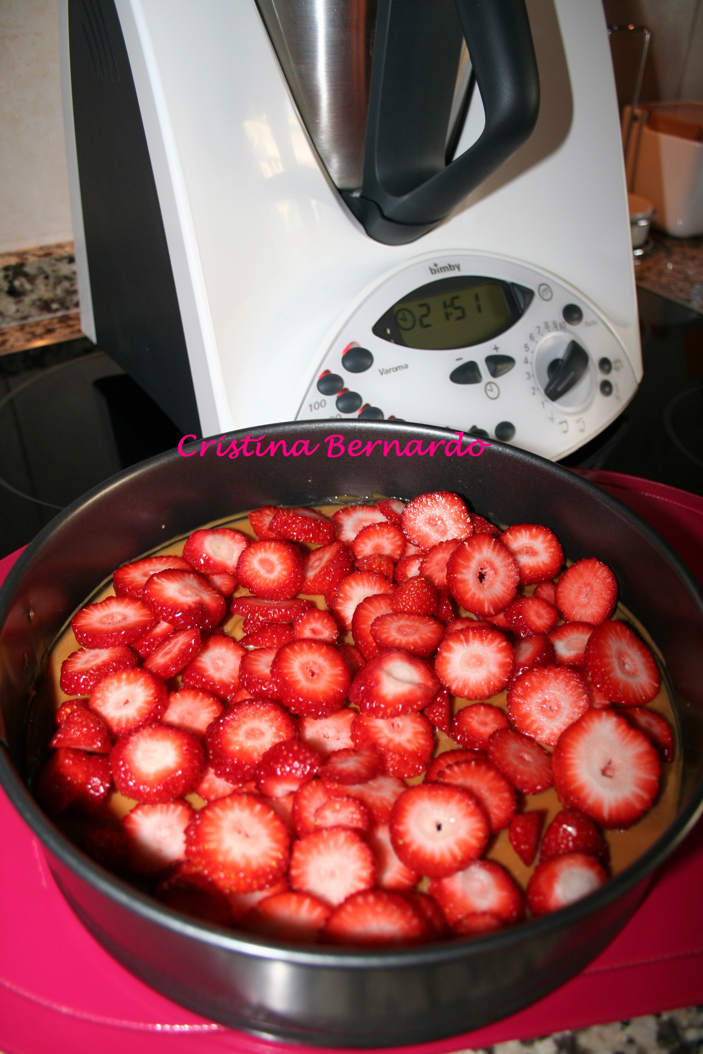 4. Em seguida, forrar a camada de leite condensado com os Morangos que