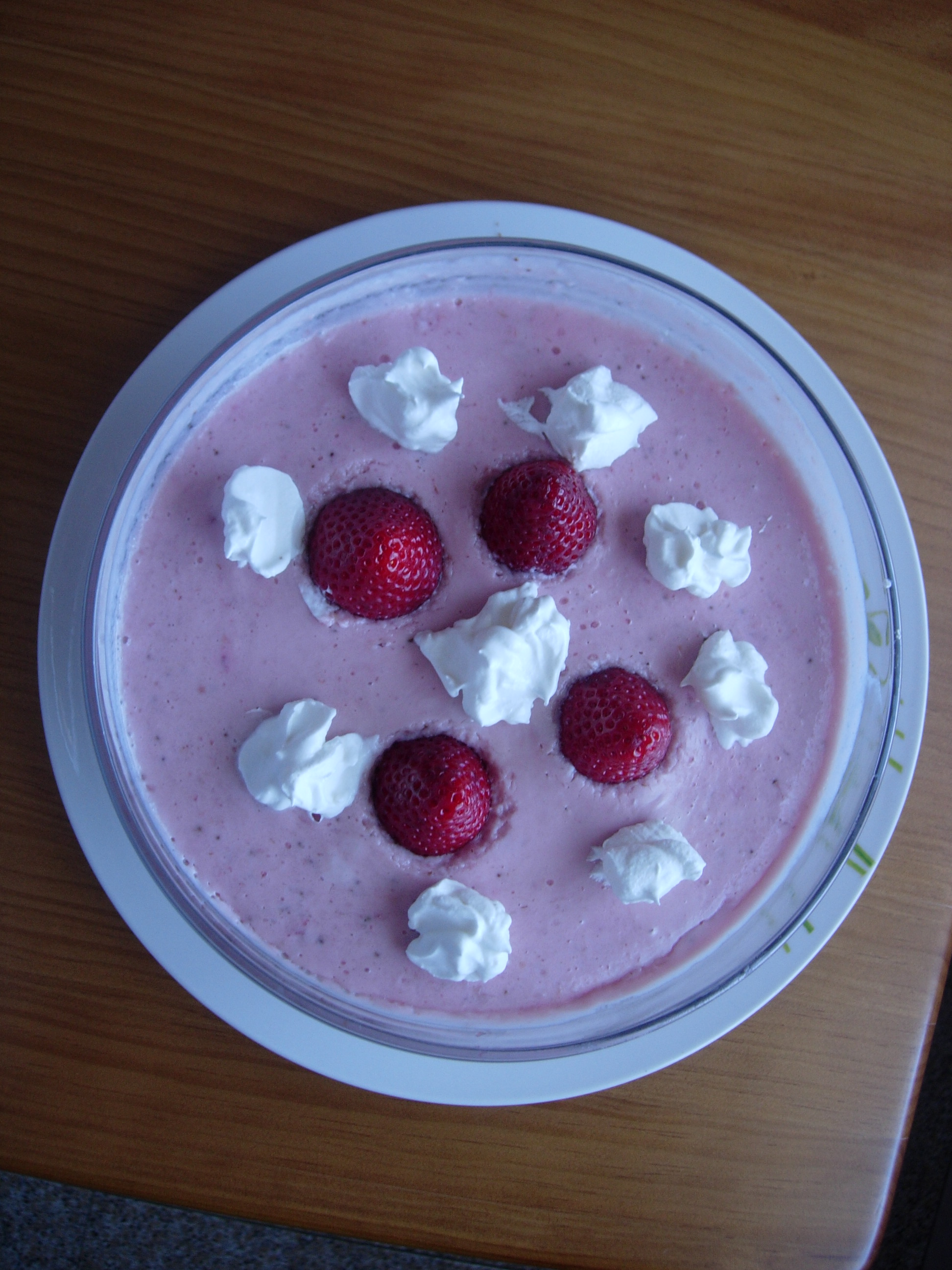 Junte então os morangos bem lavados, o leite condensado e as natas e bata na velocidade 4 durante 2 minutos.