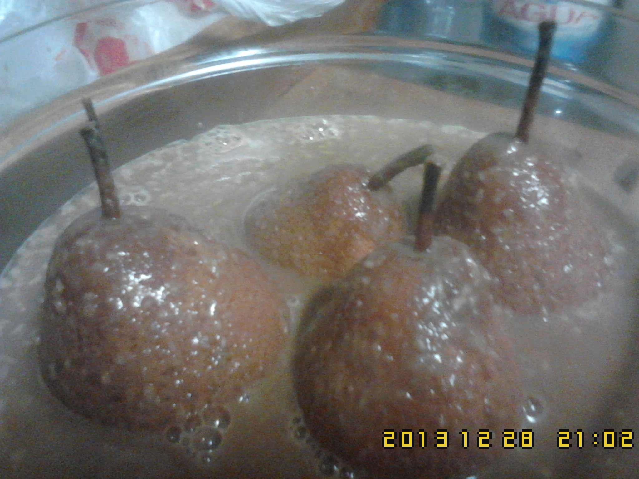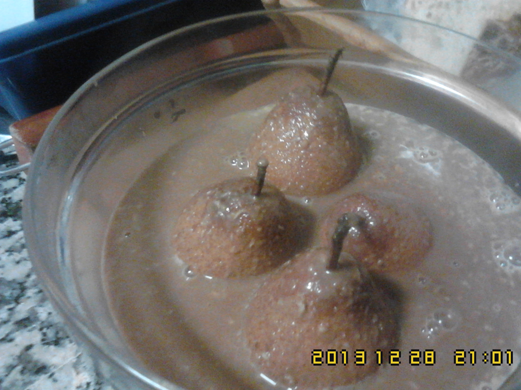 1)No copo ponha a água.A seguir coloque o cesto.Dentro do cesto,ponha todos os ingredientes,por fim ponha as peras.9m-V2-Varoma,a seguir mais 9m-V2-90C.,(Total,são 18m).Desligue a bimby,deixe mais 5m.2)Retire as peras e ponha numa travessa.O liquido,ponha á parte num termo.Pode servir de chá se quiser.È muito bom.3)Sem lavar o copo,eu aproveitei,salame,juntamente,com o molho das peras,coco,3m-V2-60C.No fim ponha em cima das peras.Pronto a servir.Eu fiz com 4 peras, o cesto dá para 6.