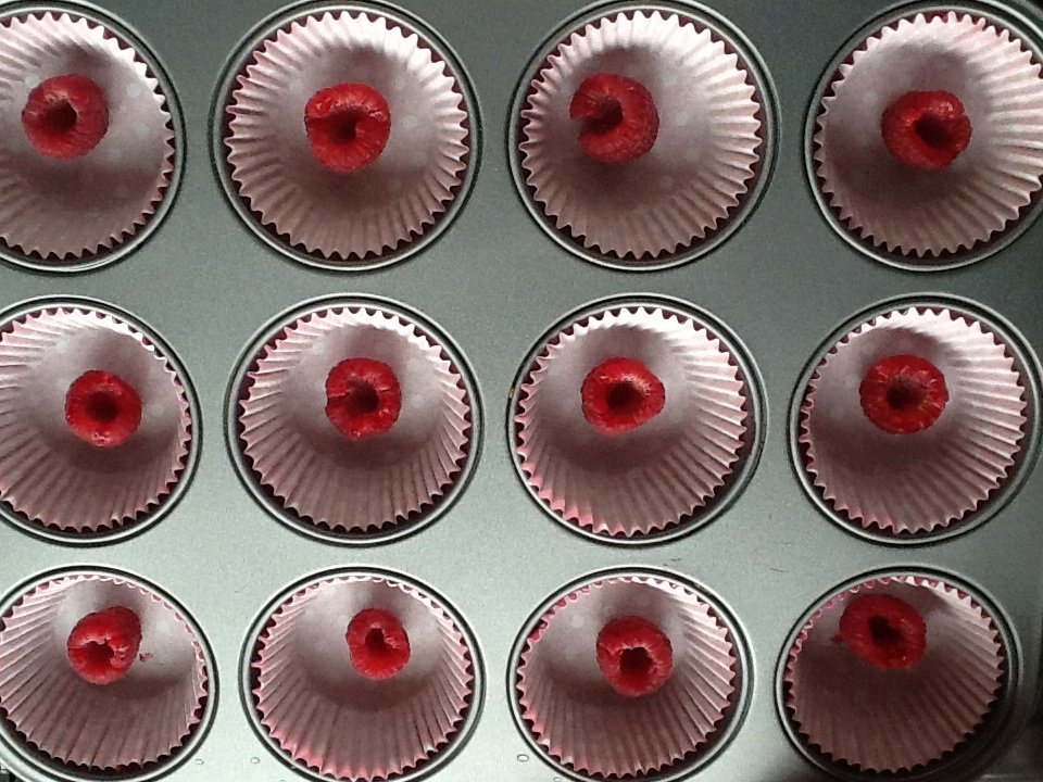 Numa forma para queques coloque uma framboesa em cada espaço.