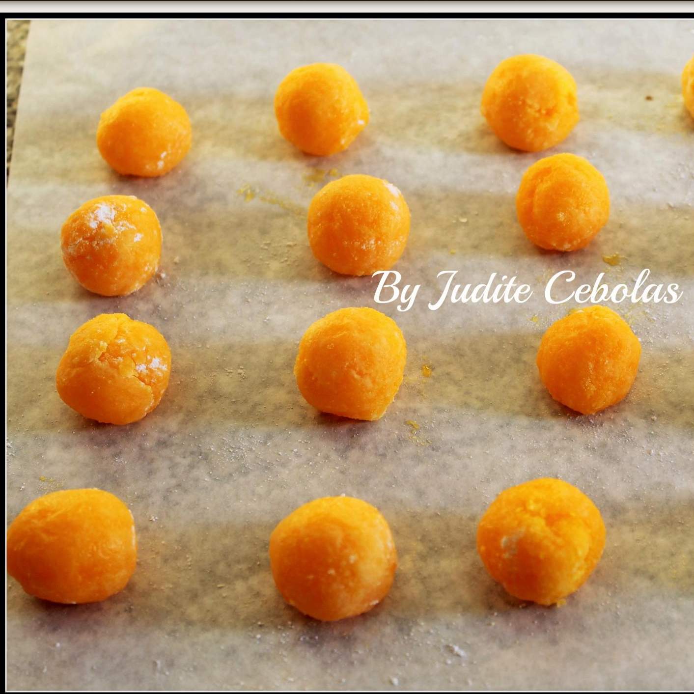 Enrolar com as mãos, pequenas bolinhas do creme das gemas e passá-las por açúcar em pó (tenho sempre preparado guardado num frasco e pulverizado junto com um pouco de maizena)