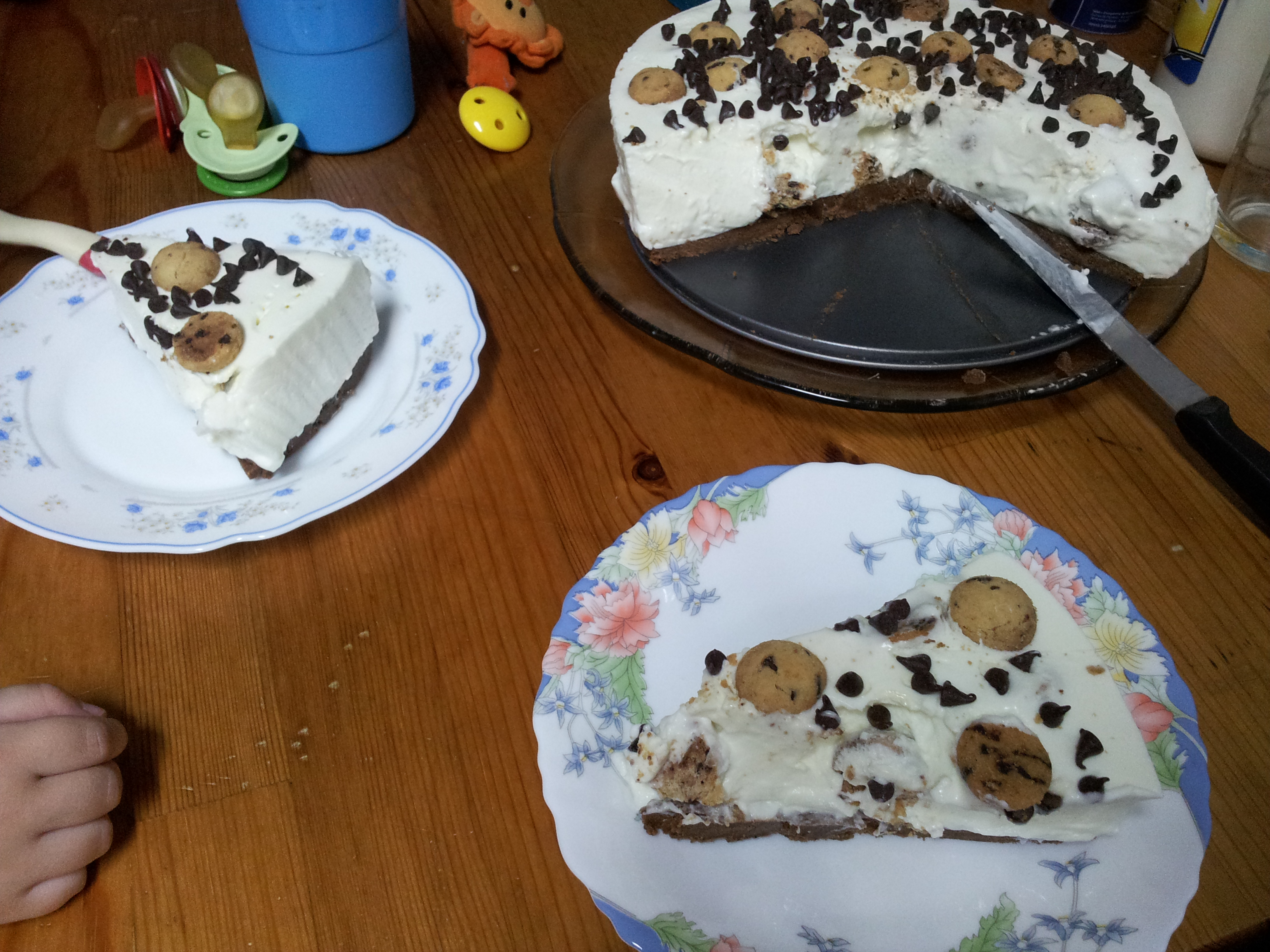 Colocar na forma e adicionar 2 dos pacotes de mini Chips Ahoy e empurra-las para o meio do creme distribuindo-as uniformemente por toda a tarte.