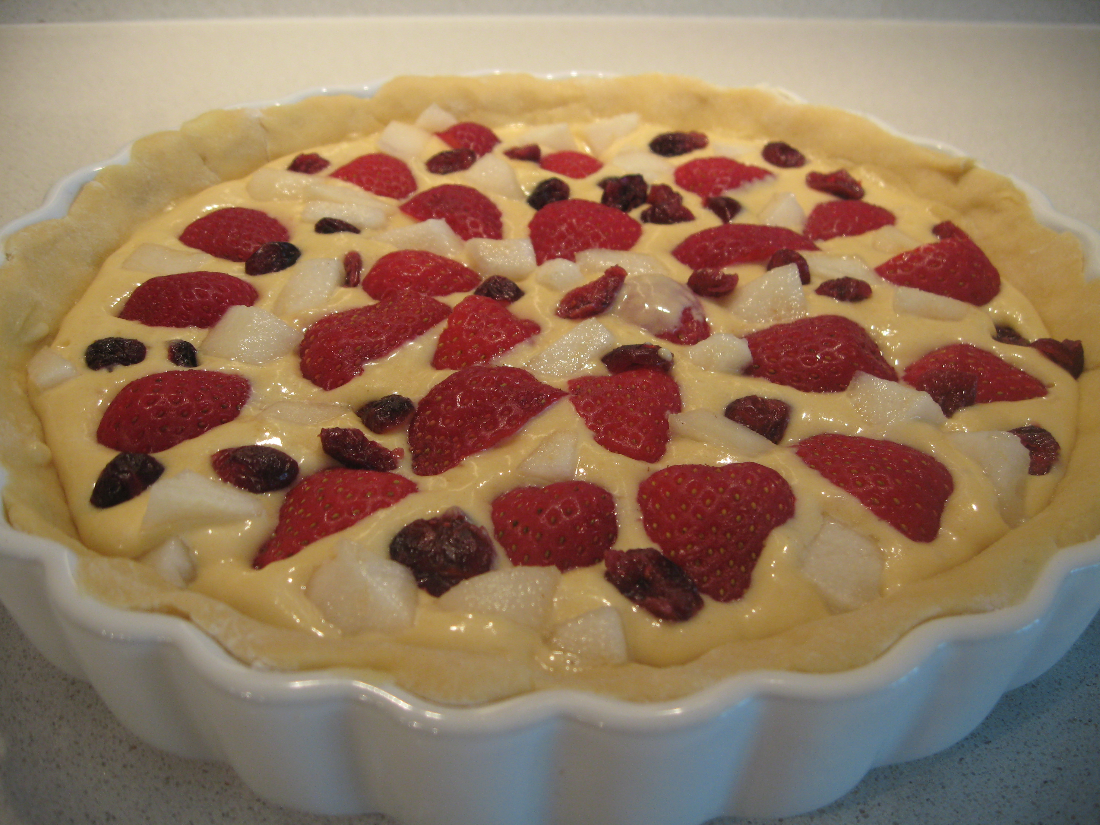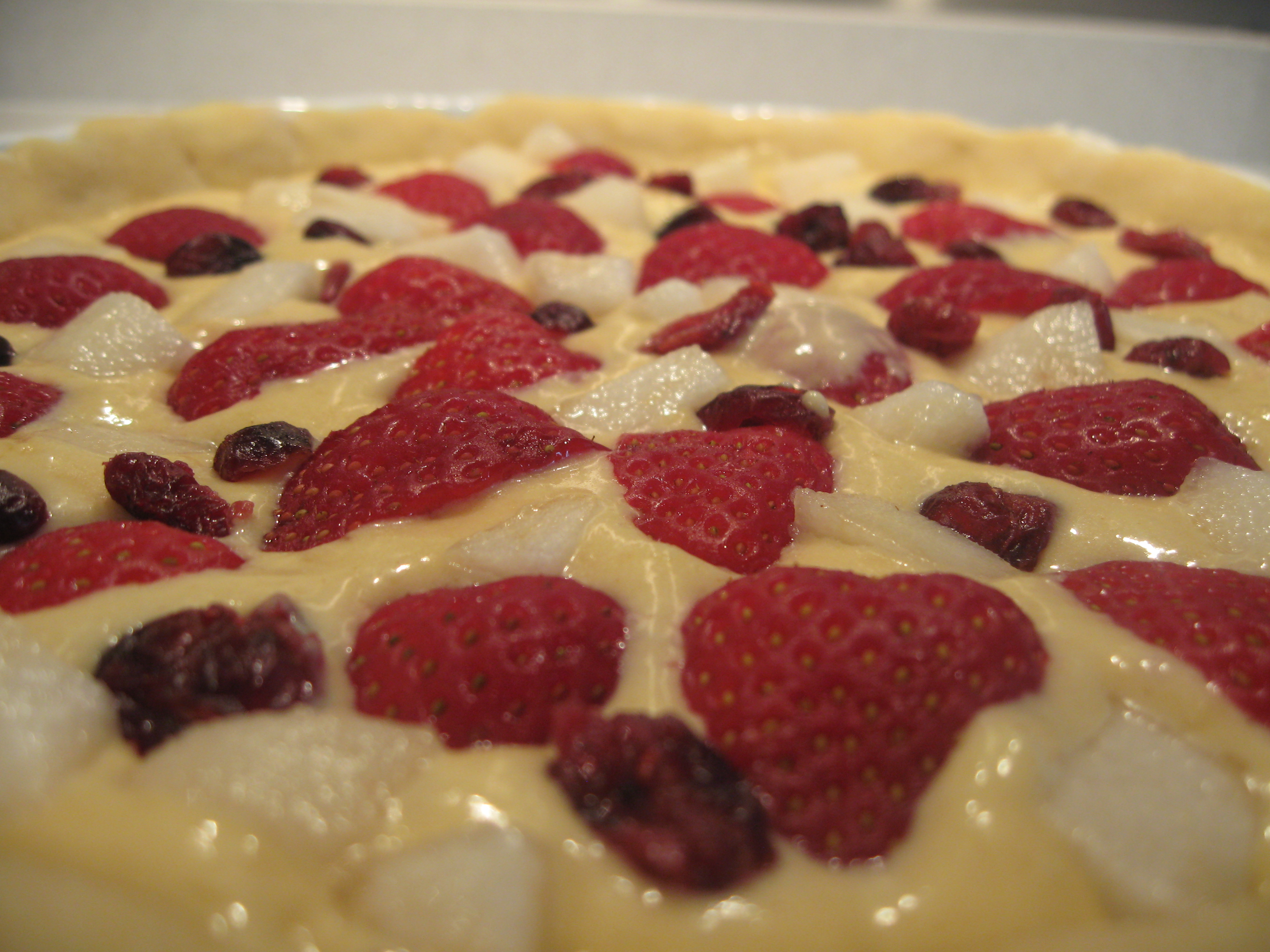 3. Sem lavar o copo, coloque 1 ovo, 1 iogurte natural, 100 gr de farinha, o fermento, 45 gr de manteiga e 90 gr de açúcar amarelo. Programe 1 minuto, velocidade 3. Coloque por cima da base da tarte. Coloque a fruta fresca espalhada por cima e os arandos secos por fim.