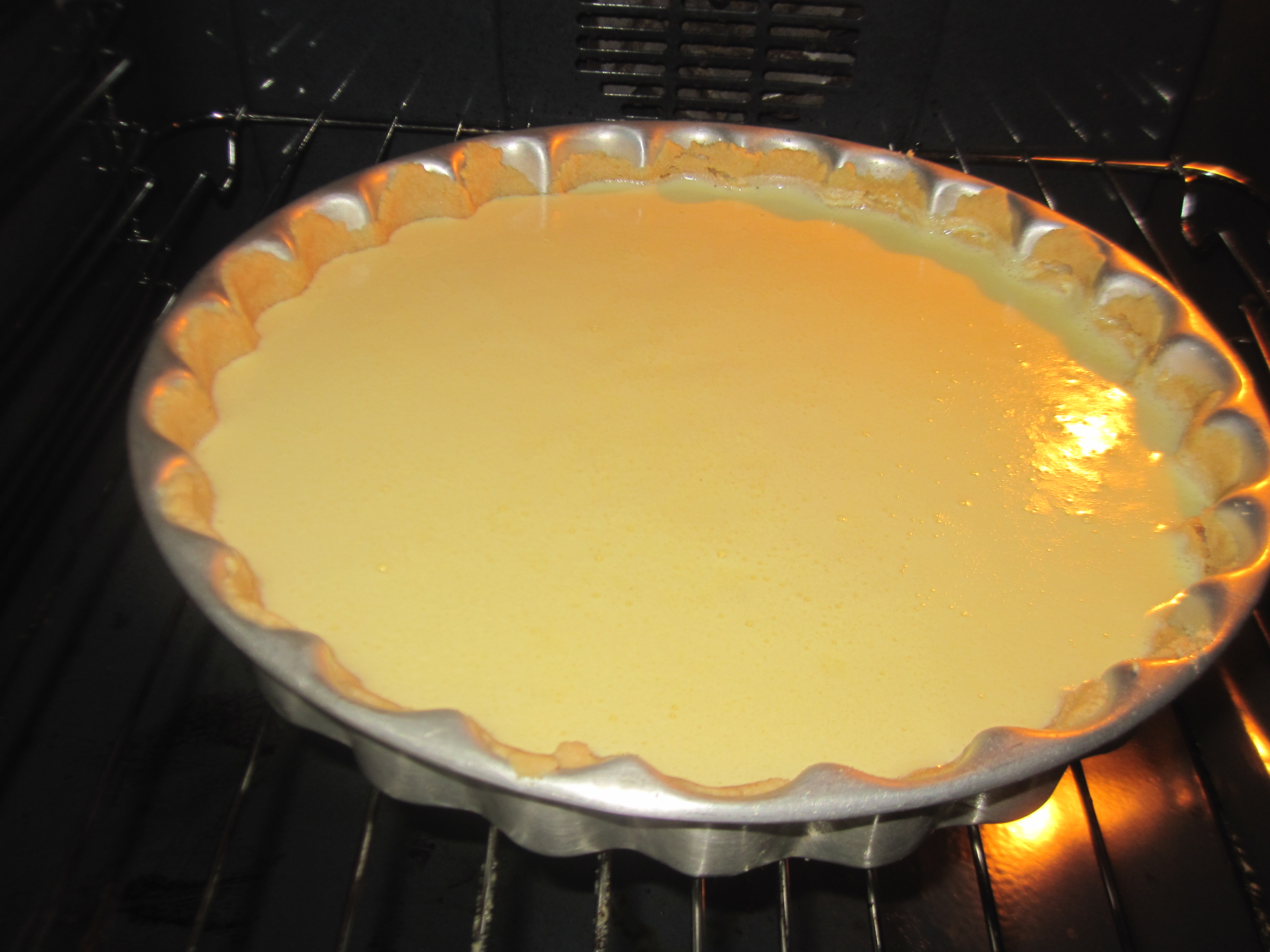 "Tampa fechada" coloque os ovos e o leite condensado e mexa a 37º, vel. 4 1/2 , 6 min.Retire do forno a tarteira e deite o preparado e leve ao forno cerca de 30 min.