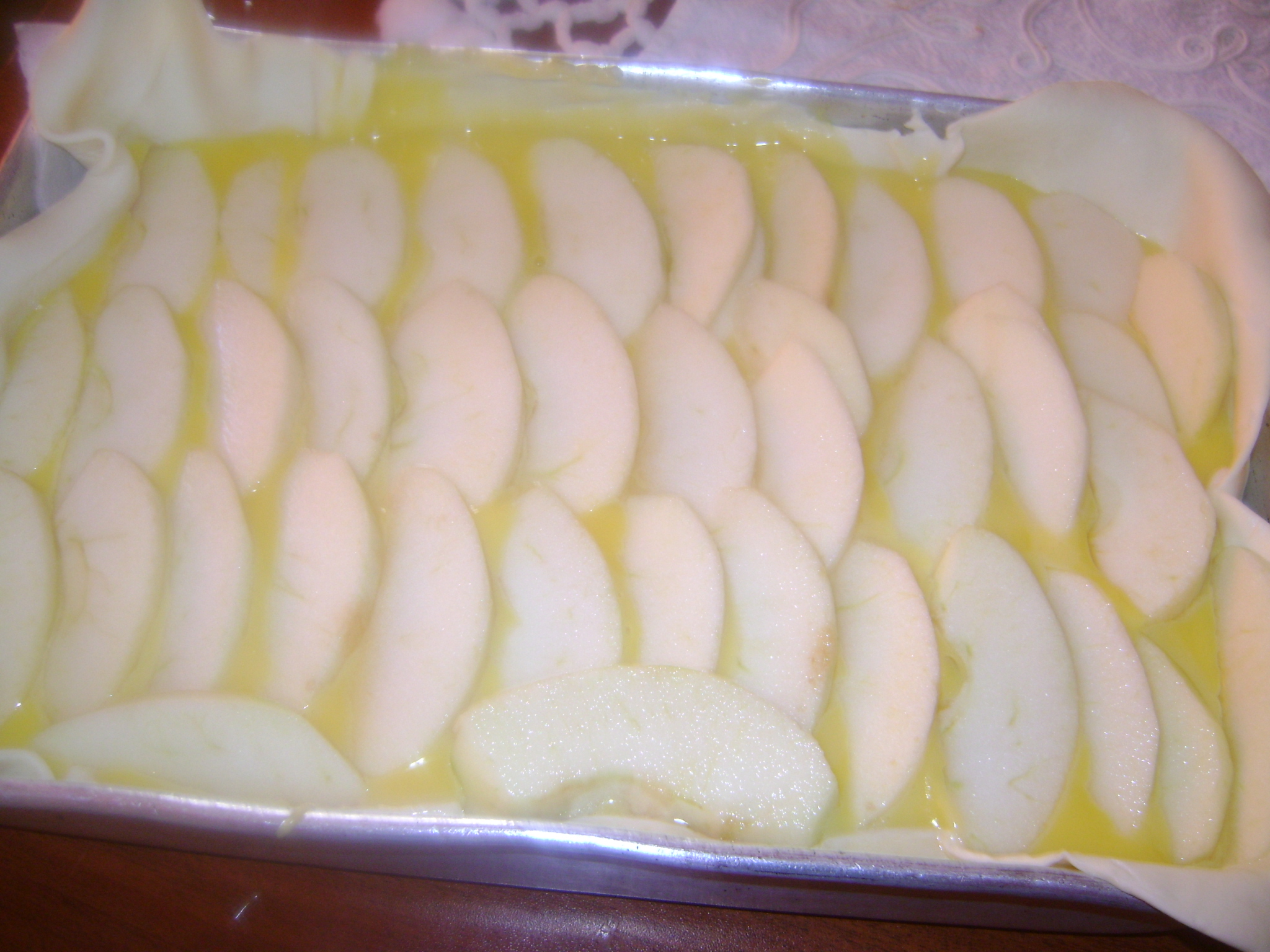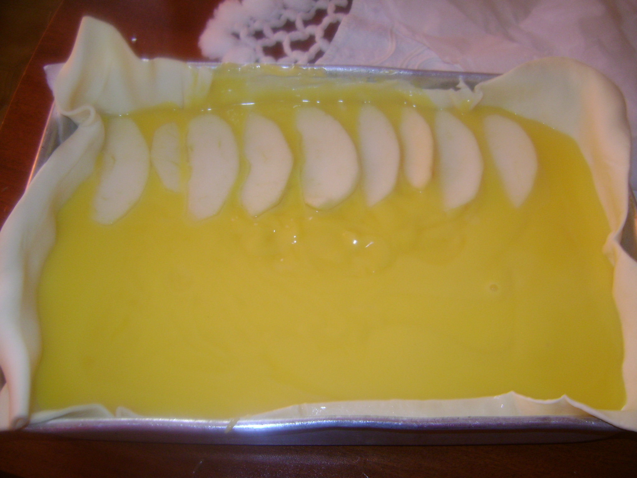 Quando terminar o tempo, retirar rapidamente e colocar numa travessa baixa (tirar a casca do limão) .ja forrada com a masssa folhada e despeja o creme de custard.