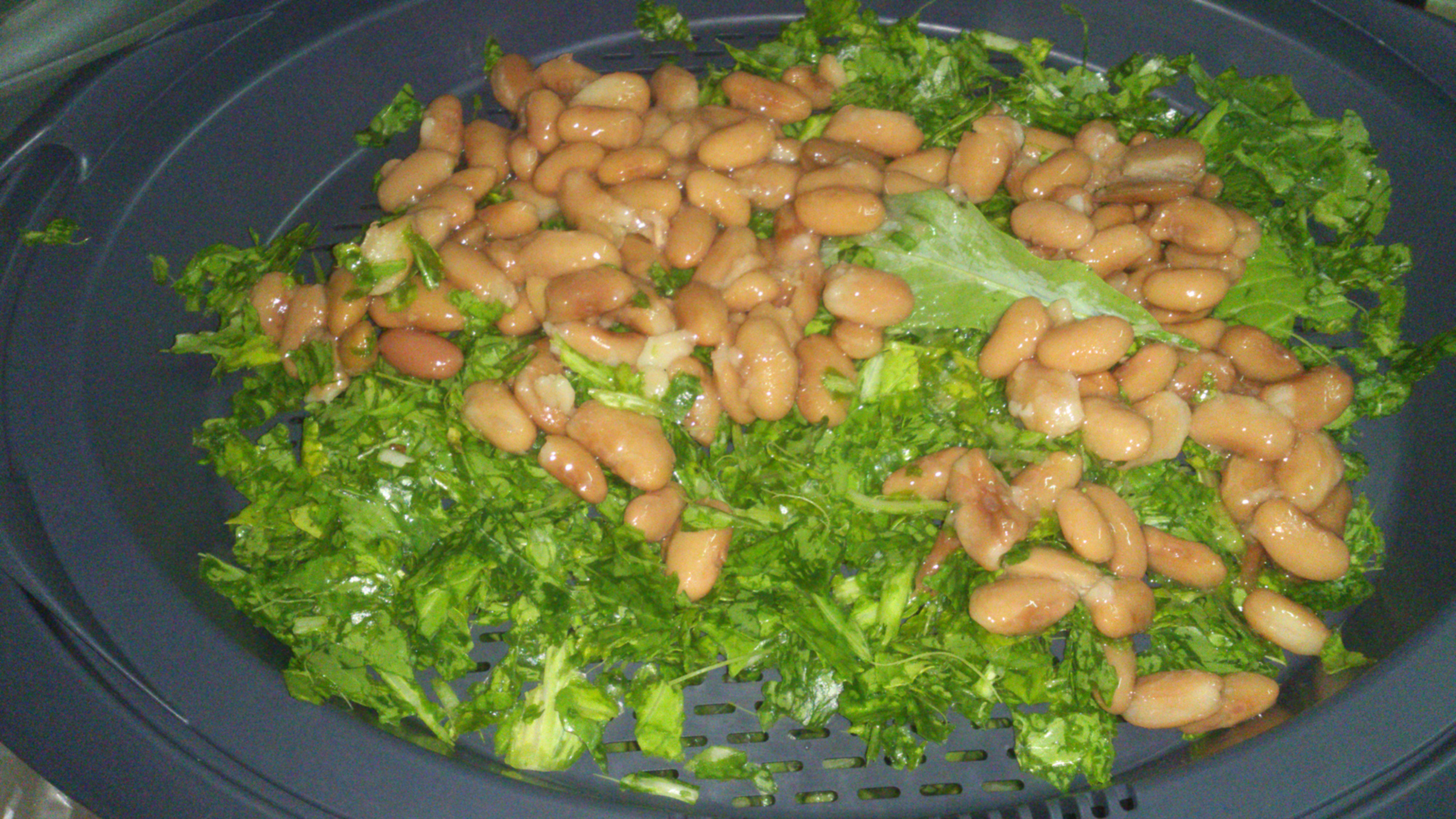 Adicionar a carne retirada dos ossos, os grelos e feijão, regar com o azeite, e envolver com a espátula.