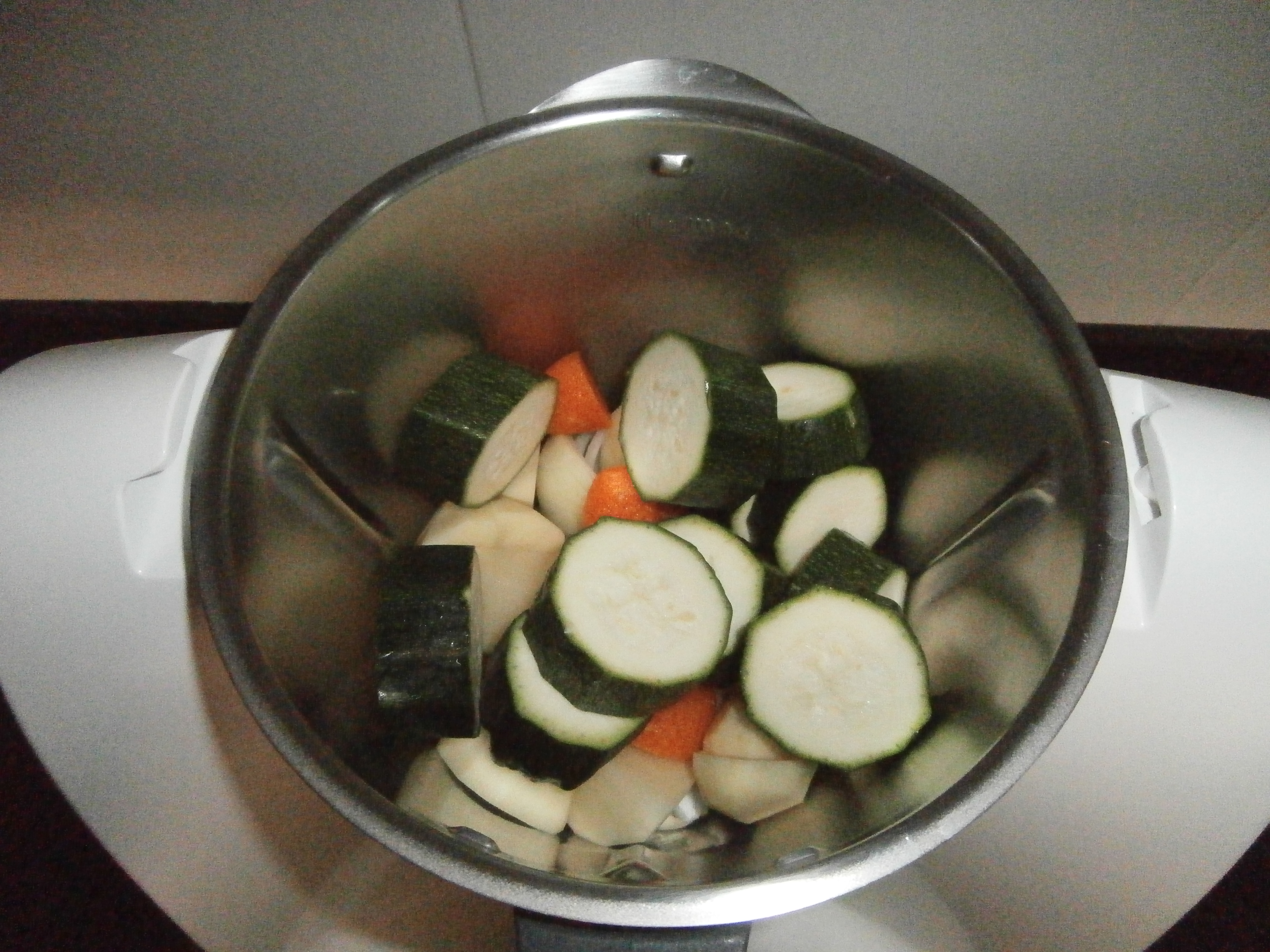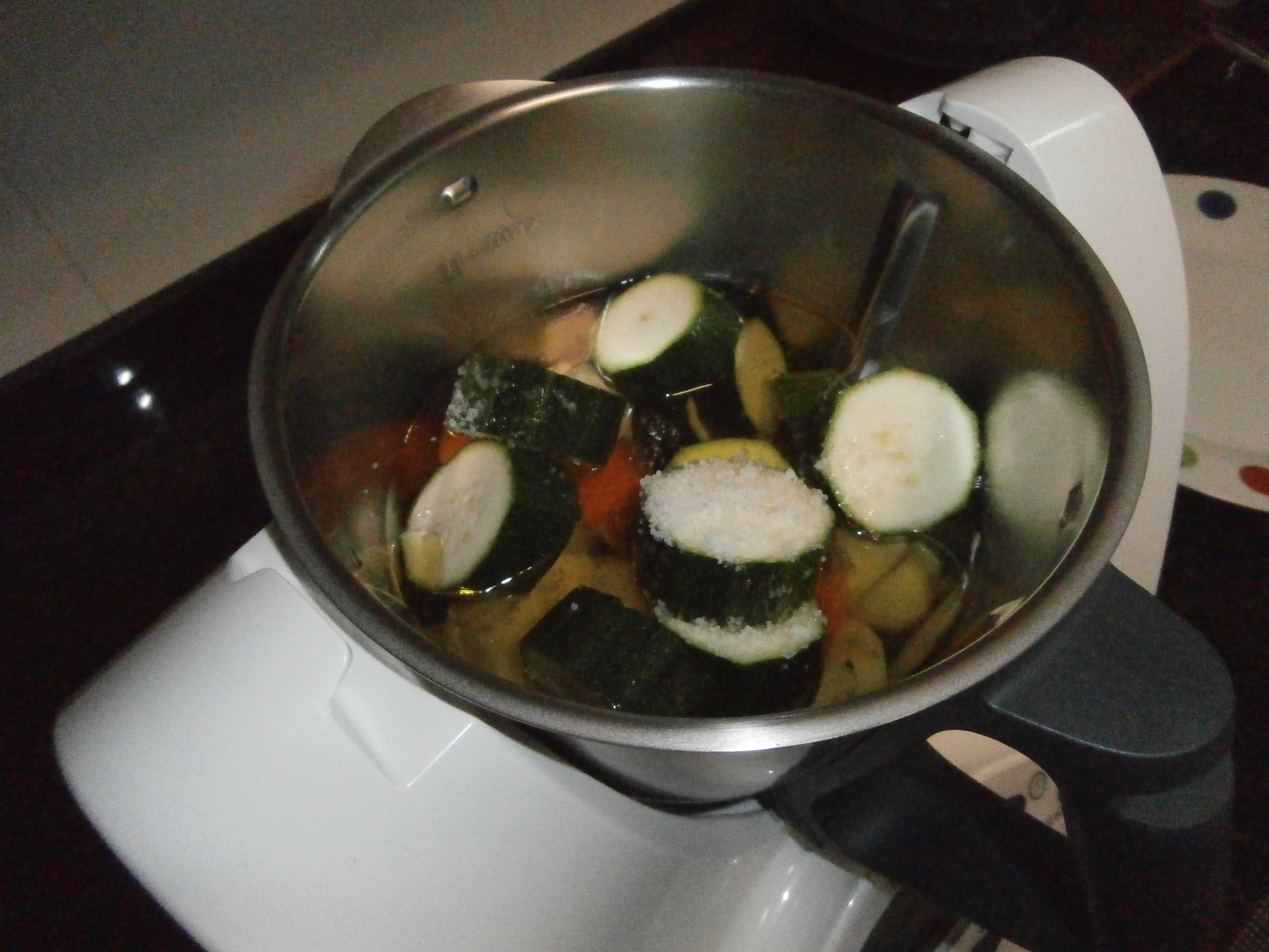 Colocar a água quase a cobrir, não coloquem muita pois depois fica demasiado líquida por causa do courgette.