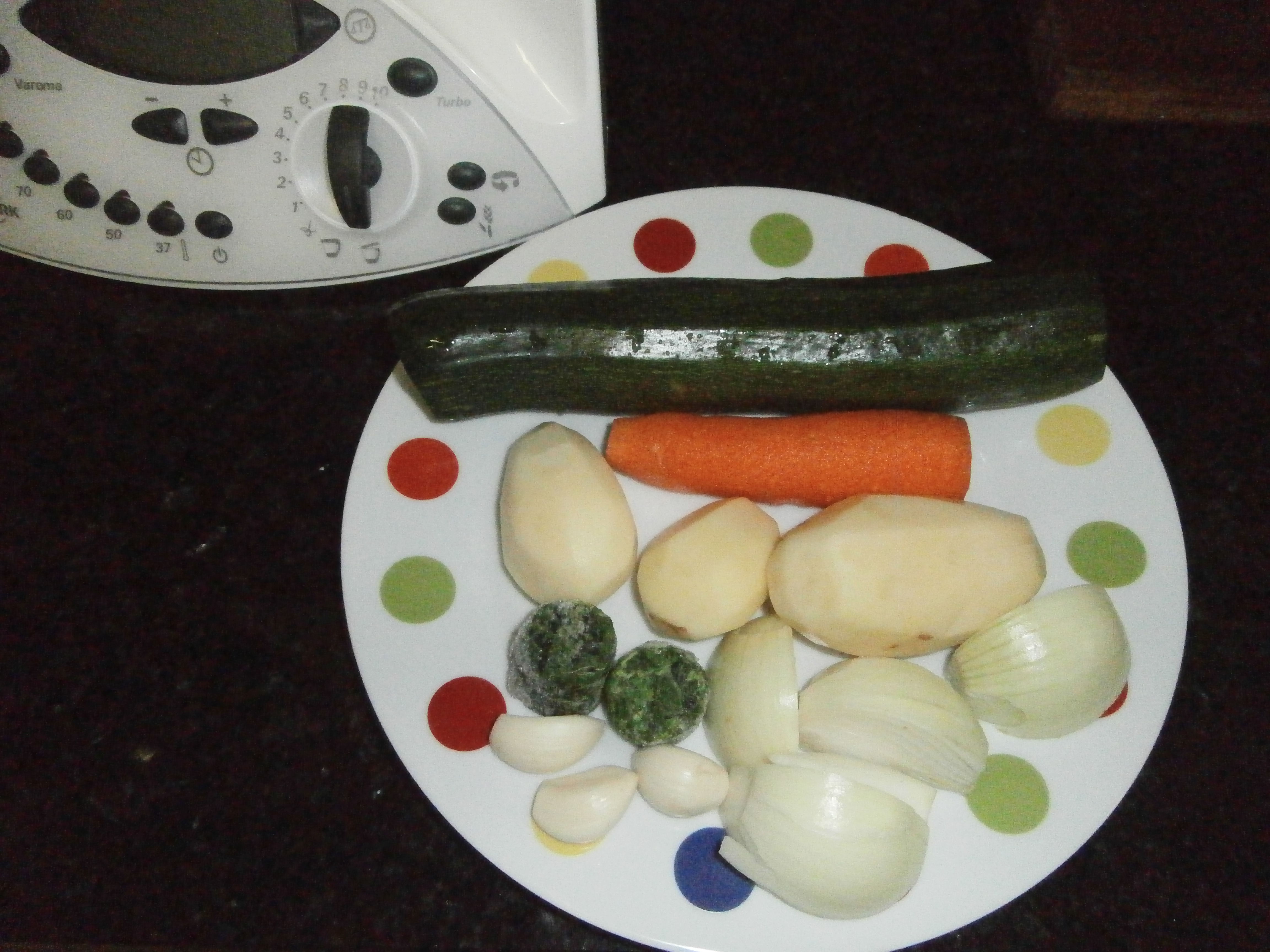 Descascar os alhos, a cebola, a cenoura, e as batatas cortar as extremidades do courgette, e colocar tudo dentro do copo com os cubos de espinafres e o azeite e o sal.