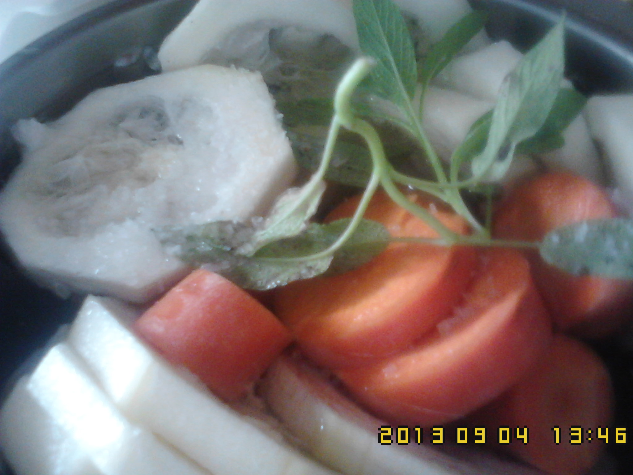 Depois coloque,curgete,batata,cenoura,alho francês,vagens,salva,aproveite os alhos, os coentros que fez com o peixe.45m