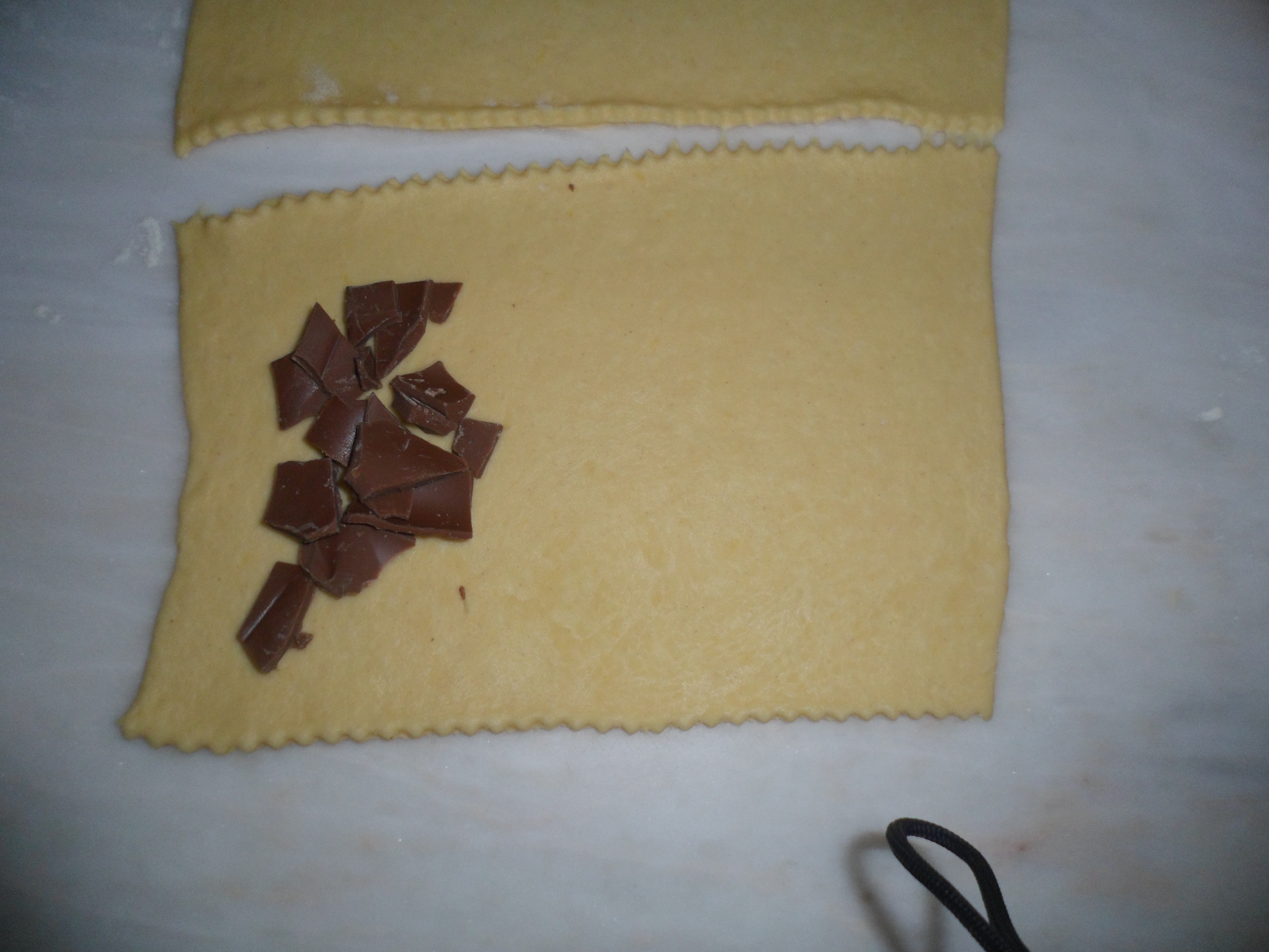 Estenda a massa com o rolo e faça quadrados com mesma. No centro do quadrado coloque uns pedacinhos de chocolate. Feche o quadrado e frite de seguida.