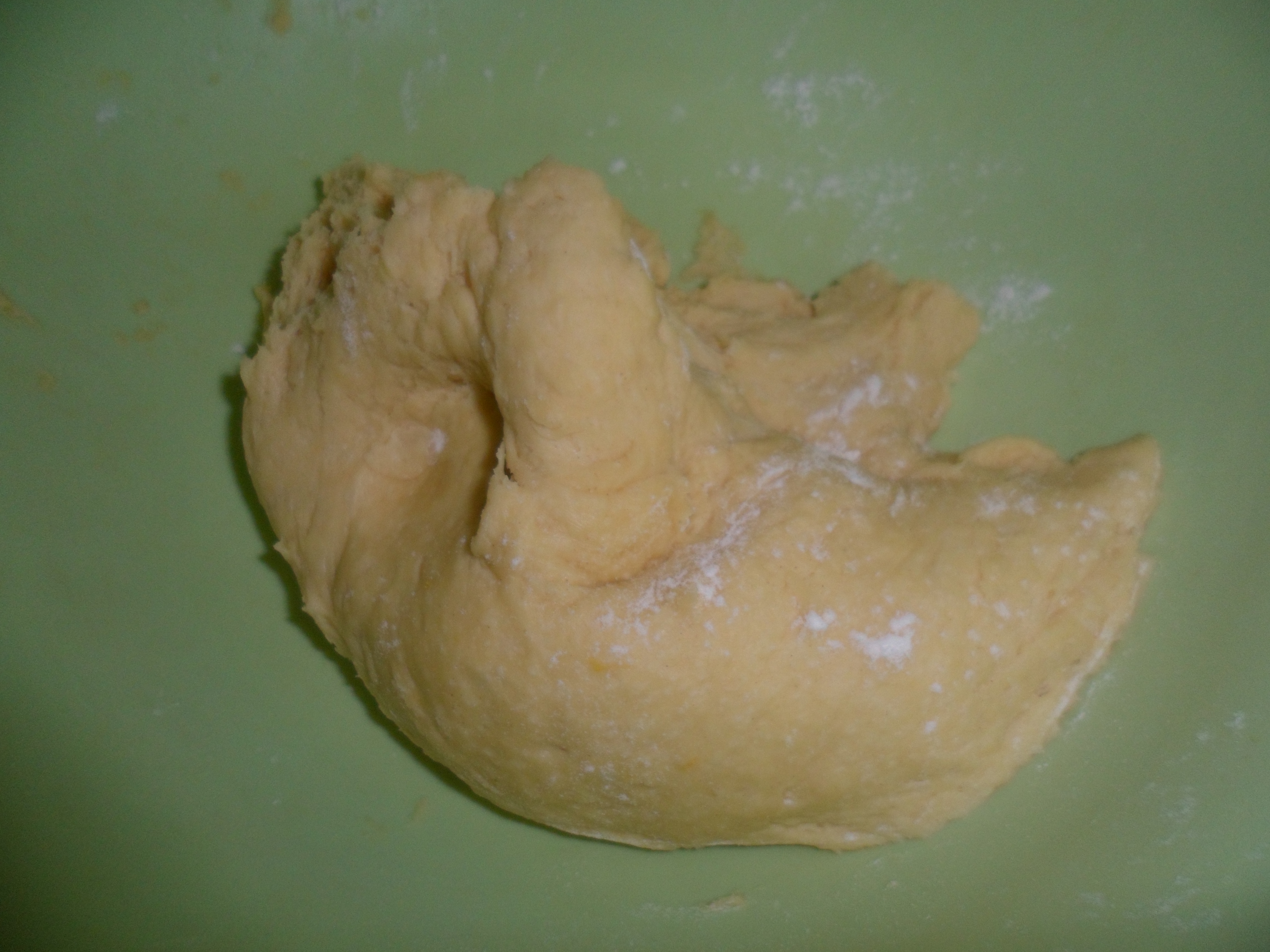 "Espiga" 1m40seg.Se verificar que a massa ainda se cola um pouco , verta-a para um recipiente e polvilhe-a com farinha, envolvendo-a. Reserve num local á temp. ambiente até que dobre o volume.