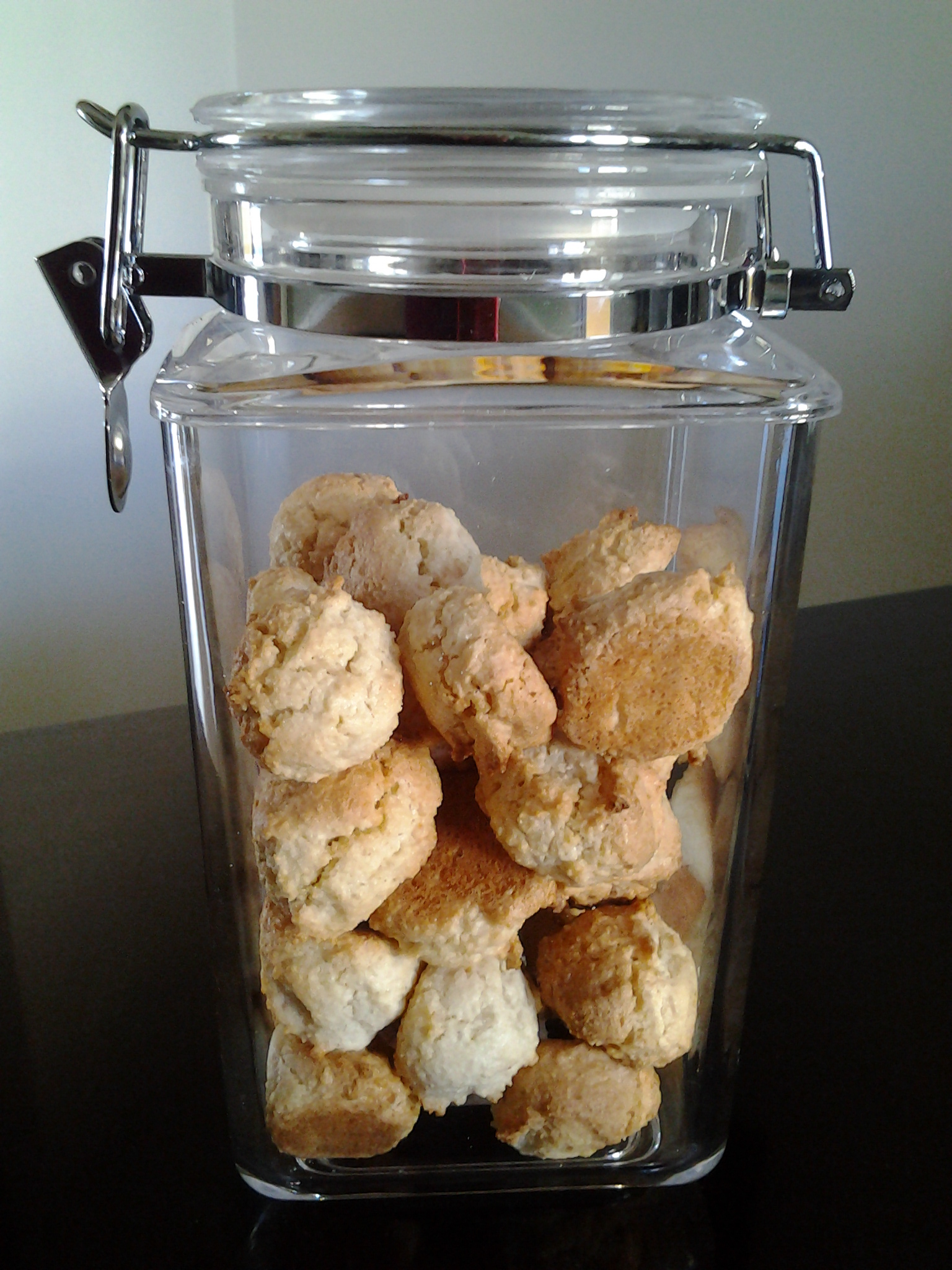 Fazer bolinhas pequenas com a massa, colocar sobre papel vegetal e levar 10-12 min ao forno pré-aquecido a 180ºC.