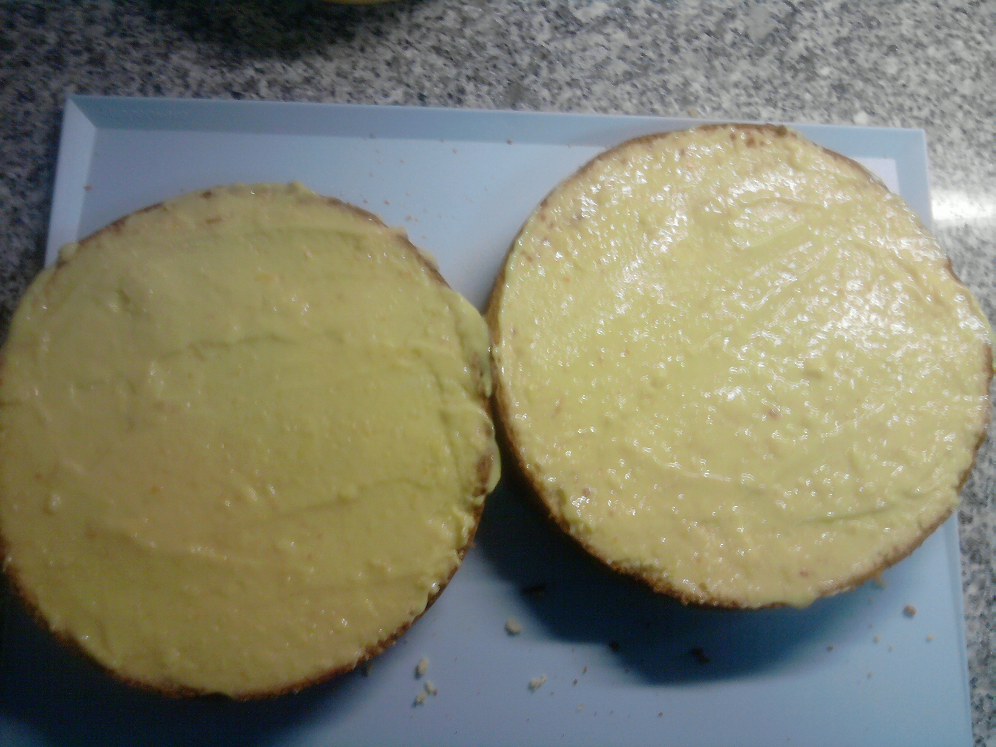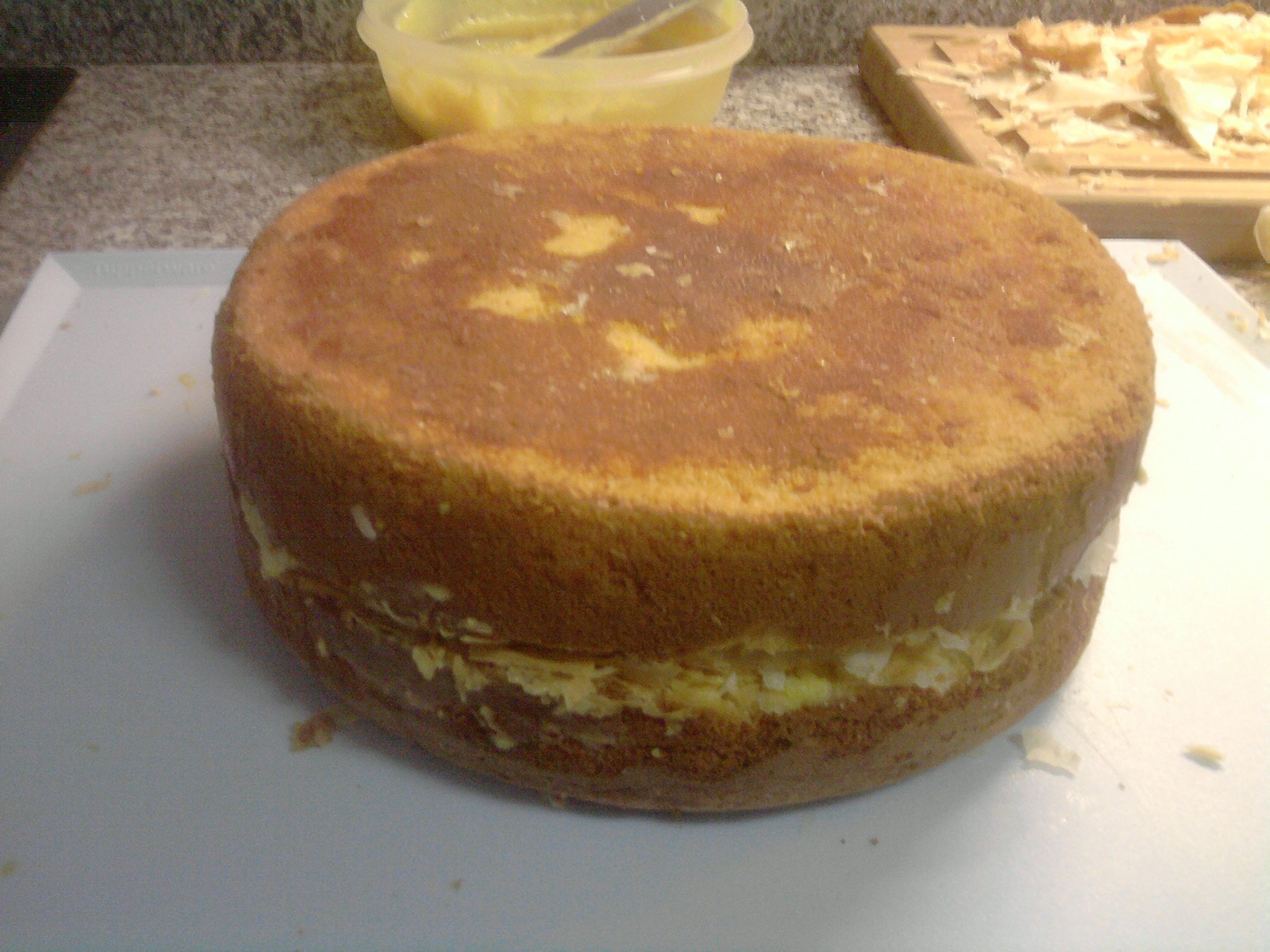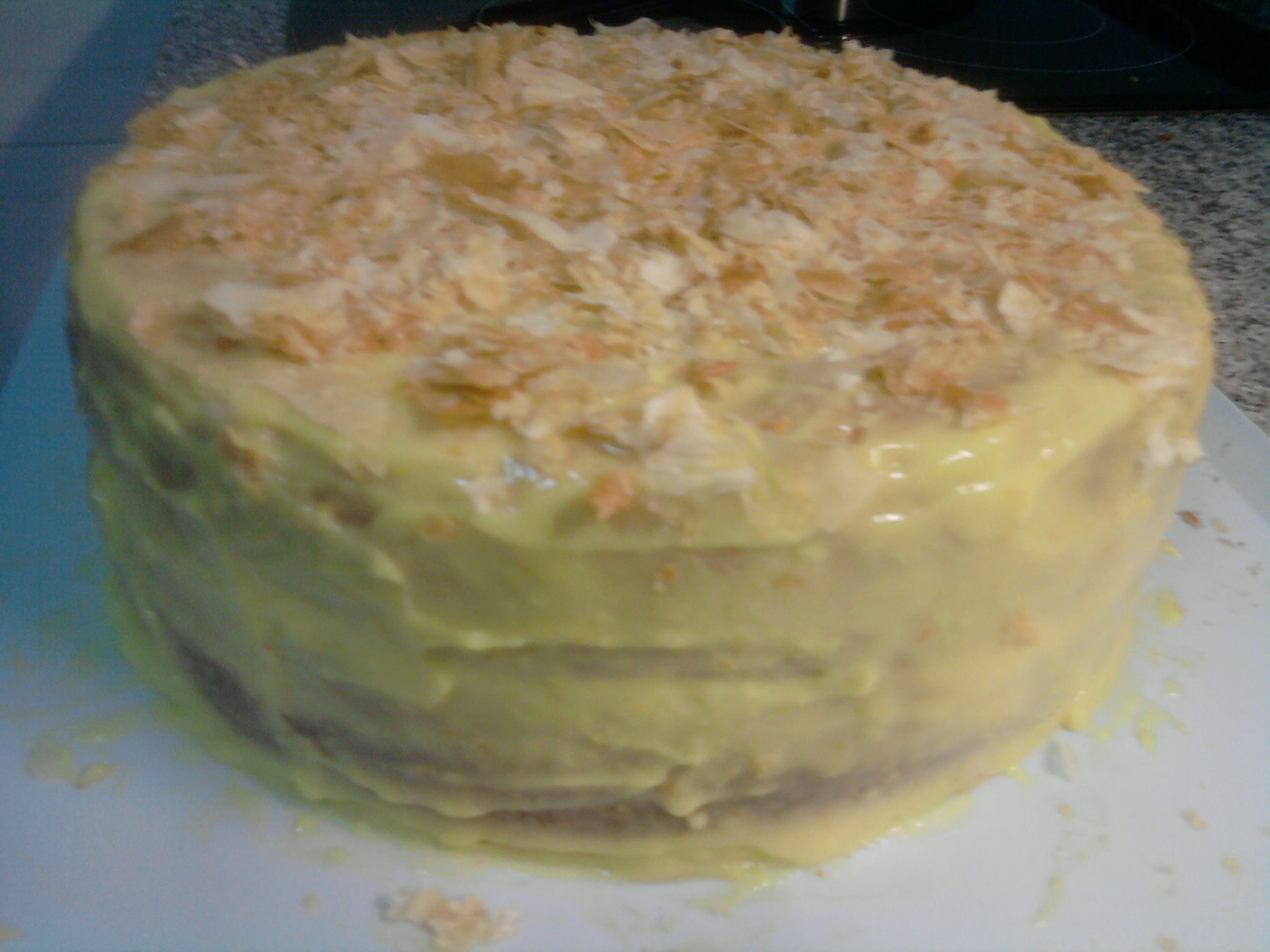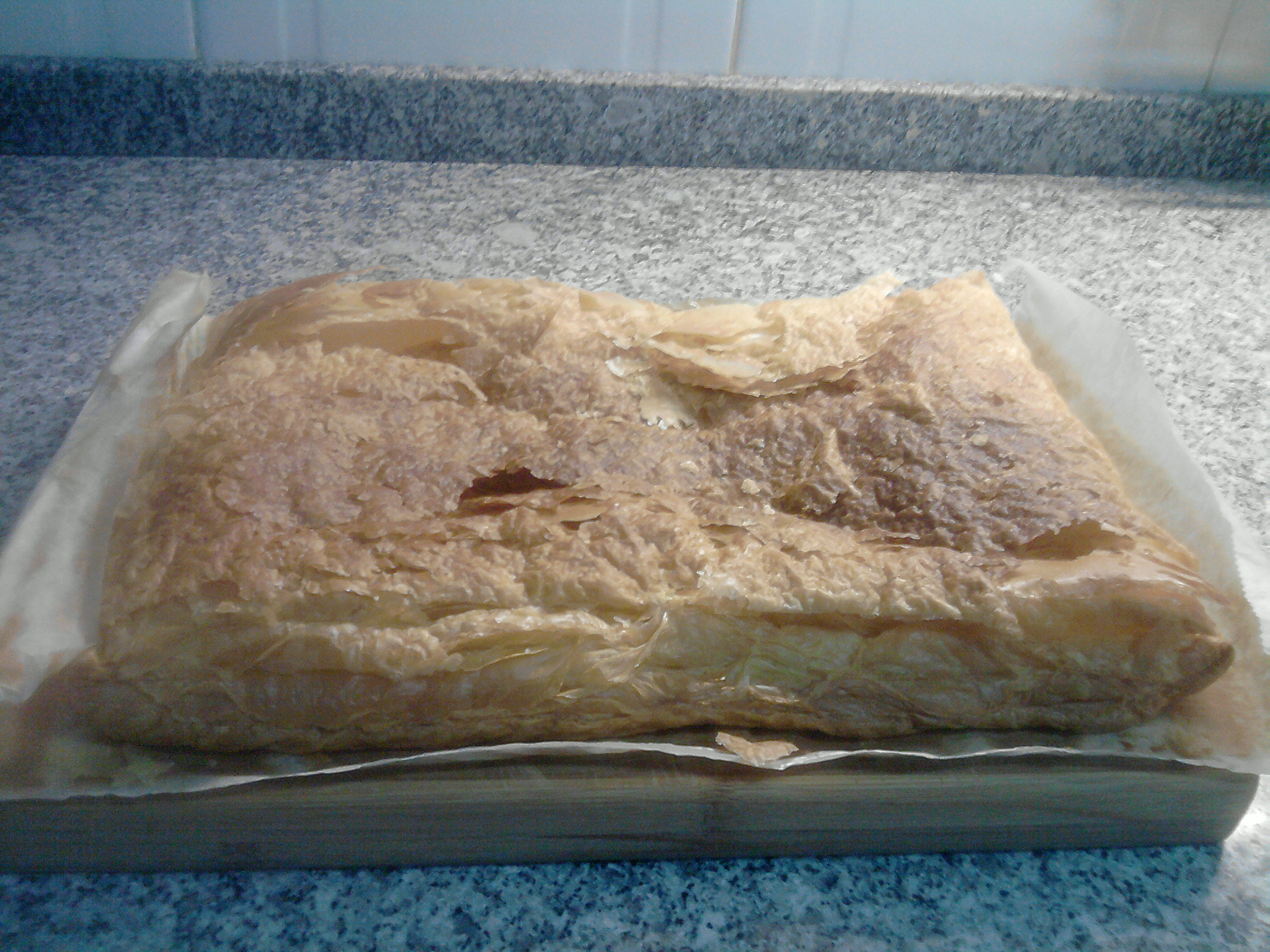 Quando o bolo tiver arrefecido, parta-o a meio, recheie as duas metades com o creme e entre estas coloque a massa folhada previamente cortada com o formato redondo do bolo. Reserve o resto da massa folhada. Quando montar as 3 partes barre o bolo com o restante creme. Por fim desfassa a massa folhada e cubra o bolo com esta. Decore a gosto.