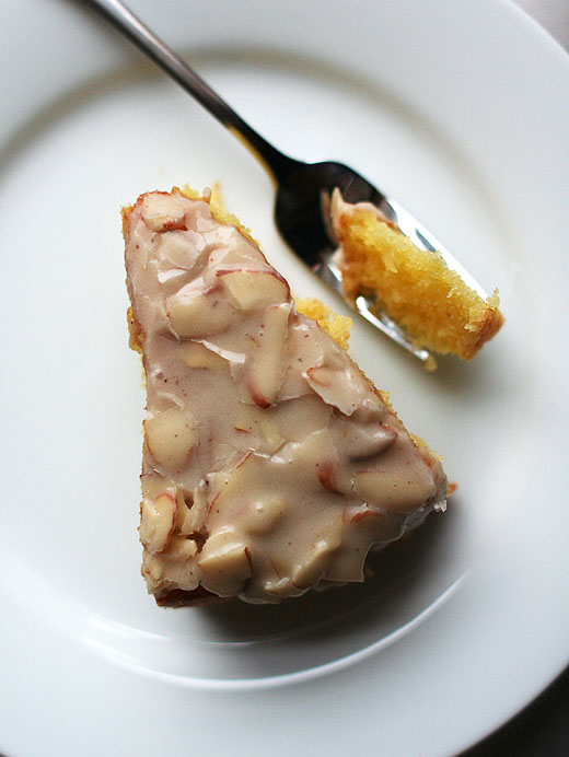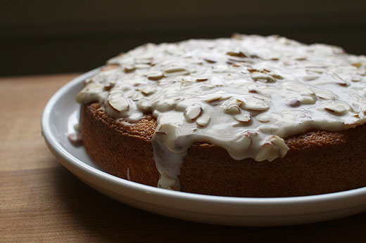Enquanto a manteiga arrefece, deite o açúcar no copo bem limpo e seco e pulverize cerca de 15 seg/vel 9. Junte o leite e misture 1 mnt/vel 4. Seleccione a vel 3 e, pelo bucal, adicione gradualmente a manteiga completamente arrefecida. Prove o molho e adicione as gotas de limão a gosto, de forma a quebrar um pouco o doce. Envolva as amêndoas com a espátula e espalhe-a em seguida no topo e lados do bolo arrefecido. Deixe a cobertura secar e assentar antes de o servir.