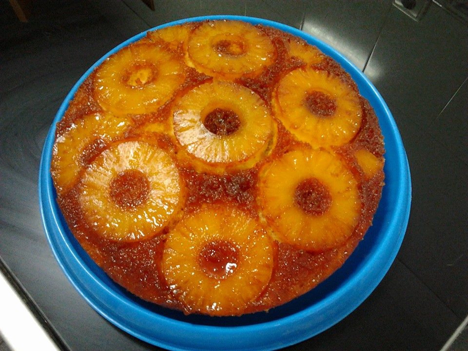 - Na forma que vai cozer o bolo faça o caramelo: deite 1 chávena de açúcar e 8 colheres de sopa de água. Leve ao lume, mexendo sempre para não deixar queimar. Quando o caramelo estiver no ponto, retire a forma do lume e, com cuidado, forre o fundo da forma com as rodelas de ananás. Reserve.