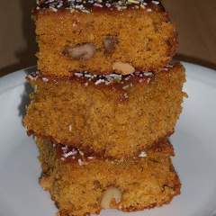 - Pré-aqueça o forno a 180º.Coloque no copo da Bimby a cenoura e rale 15 seg / vel 9.Adicione os ovos, o óleo, o açúcar e programe 1 mi / vel 6.Junte a farinha, a canela, o gengibre, o femento e envolva 15 seg vel 3.Deite o preparado num tabuleiro previamente untado e polvilhado com farinha.Distribua as nozes pelo tabuleiro e leve a cozer no forno cerca de 30 minutos. Retire e deixe que arrefeça.Leve o chocolate a derreter juntamente com o leite num tachinho em lume brando, mexendo sempre até o chocolate derreter por completo e obter um molho homogéneo.Regue o bolo com o molho e ajude com um pincel de silicone de forma a espalhar melhor pelo bolo todo. Decore de imediato com os confetis e corte o bolo em quadrados.