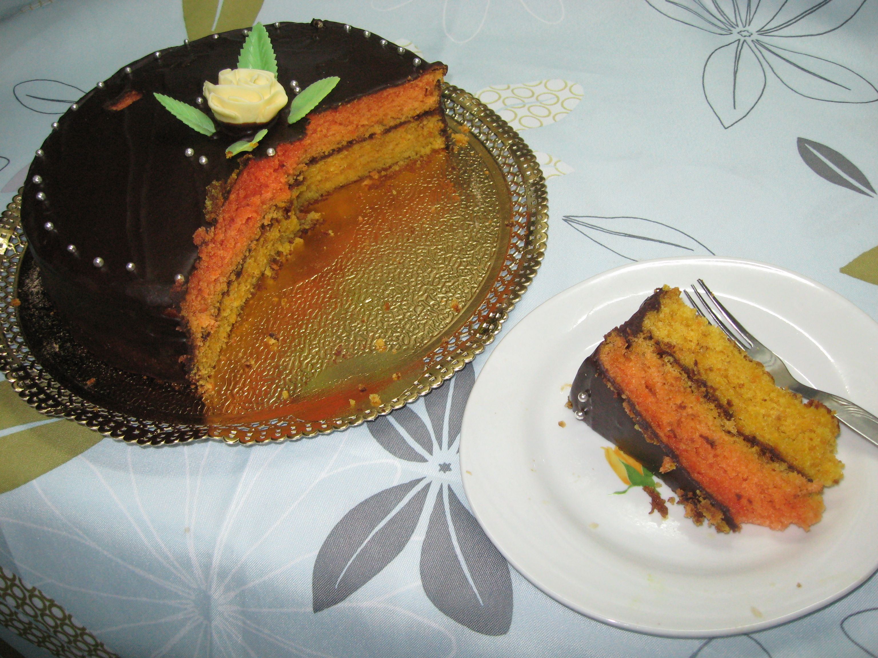 Nota: No bolo da foto dividi a massa ao meio e cozi 2 bolos, tendo colocado umas gotas de corante num deles
