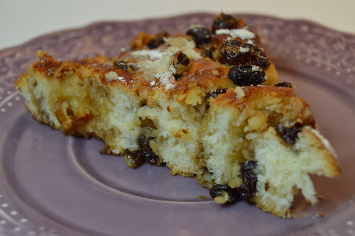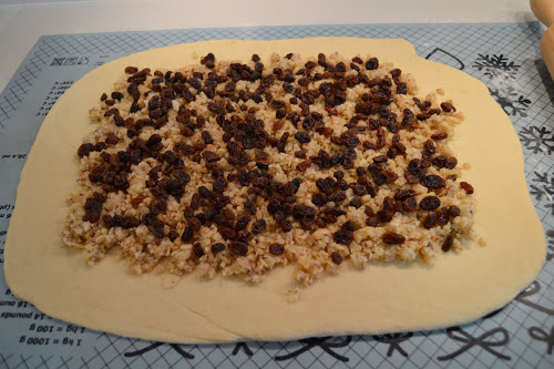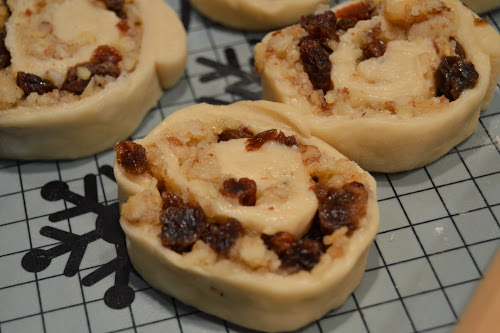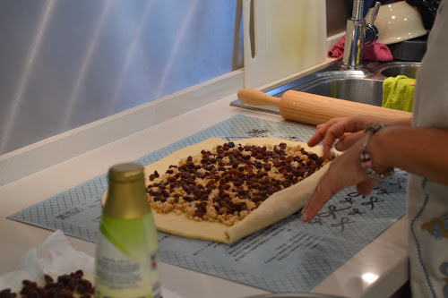 Numa superfície enfarinhada, tenda a massa em retângulo e espalhe por cima a mistura de frutos secos, açúcar e manteiga e termine com as passas (bem escorridas e secas). Enrole a massa como se fosse uma torta, tentando apertar o máximo que conseguir. Corte em fatias com dois dedos de grossura no máximo e disponha cada fatia numa forma redonda, untada e com papel vegetal, do centro para as pontas, apertando bem e eliminando todos os espaços em branco. Deixe repousar por 30 minutos.