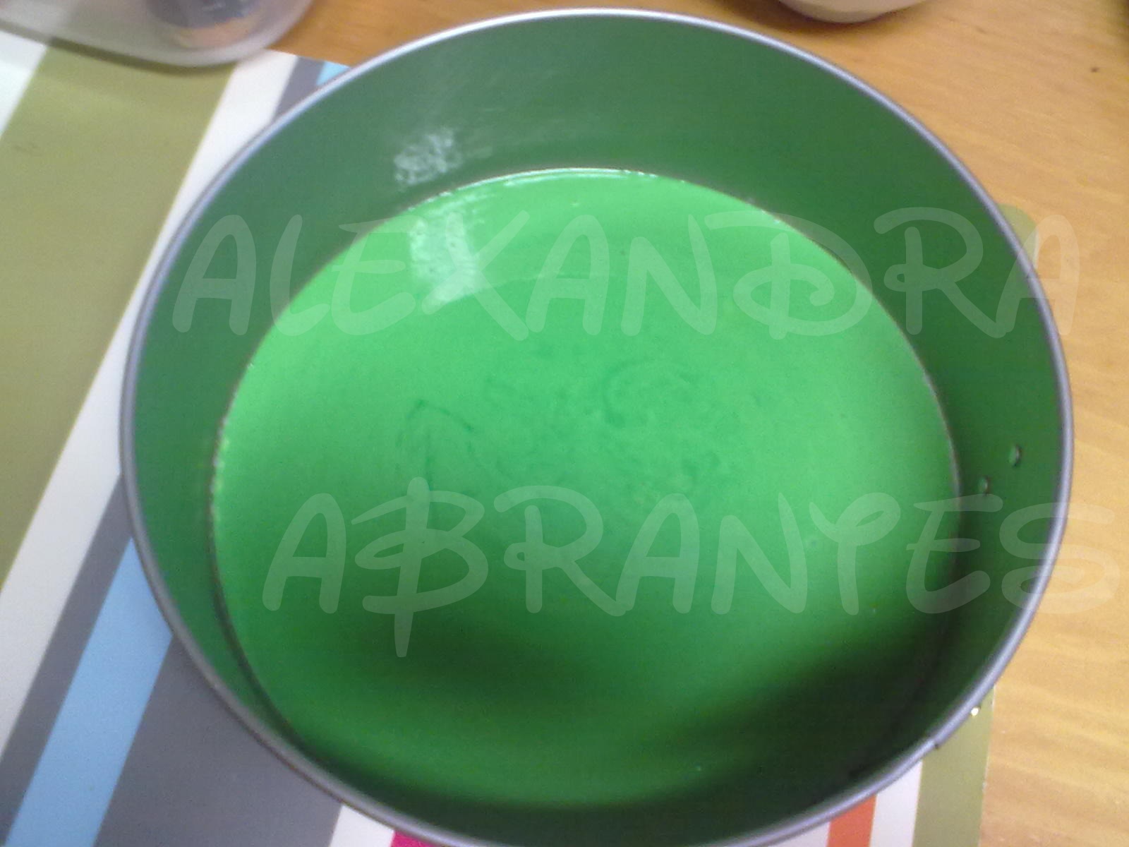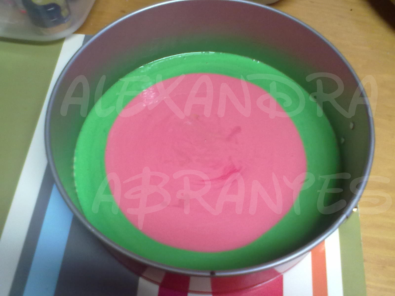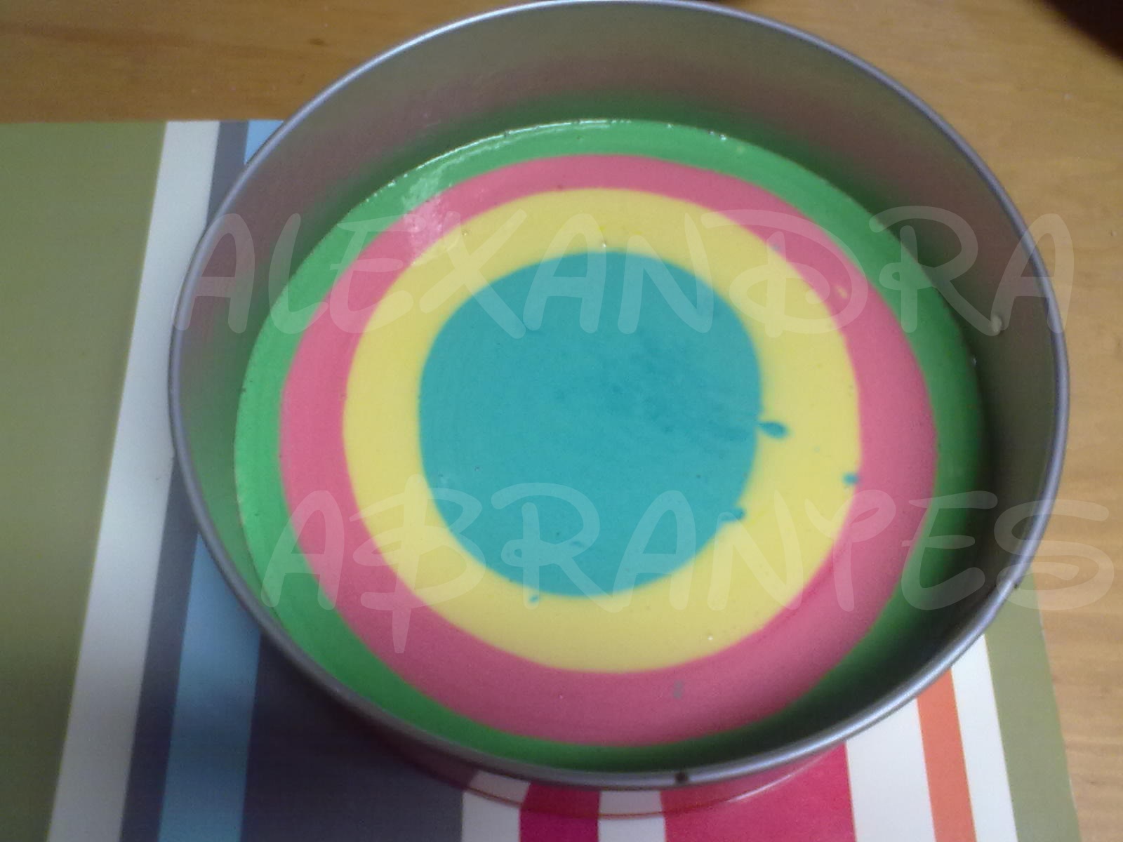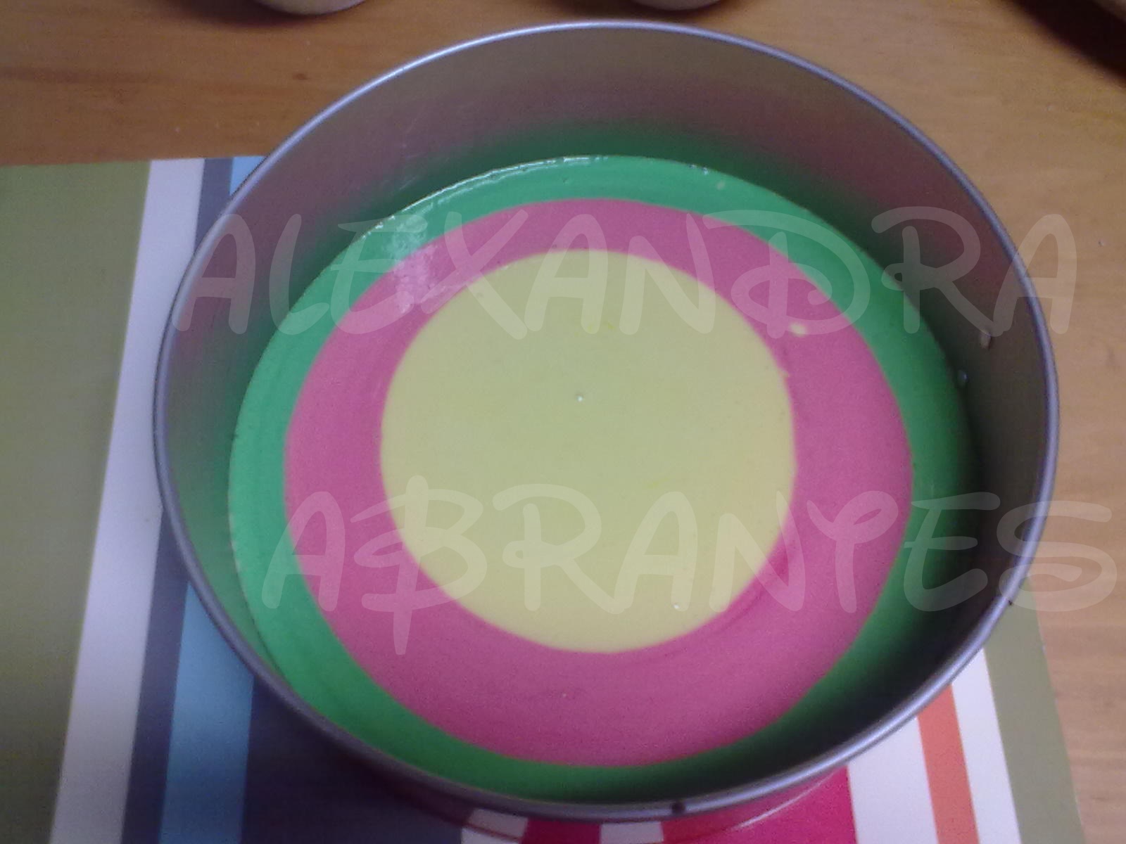 Eu usei 4 cores diferentes. Deite em camadas na forma, começando sempre a deitar a massa no centro da forma.