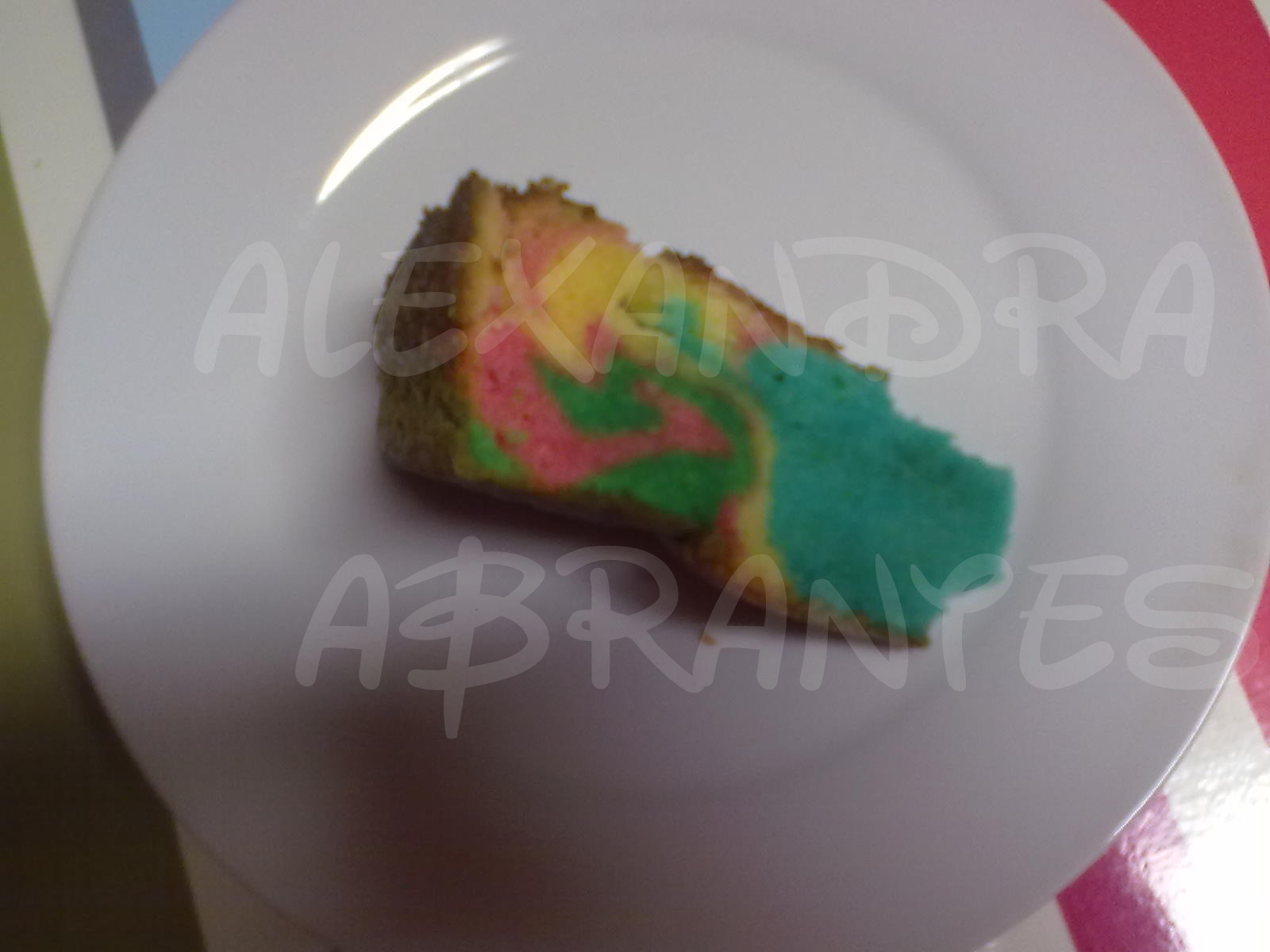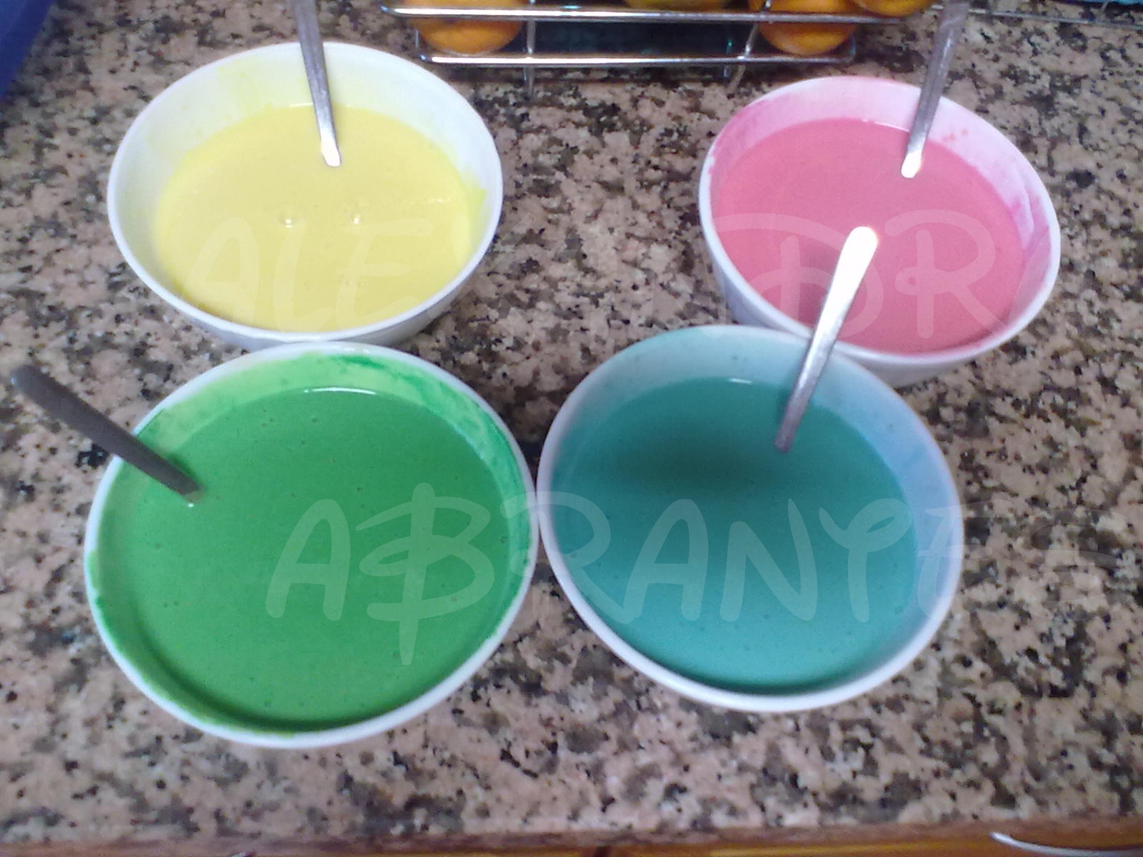 Só tem que fazer a massa do bolo escolhido, escolher uns corantes alimentares, dividi-la em tantas porções quantas as cores que quer usar e criar assim um bonito efeito.