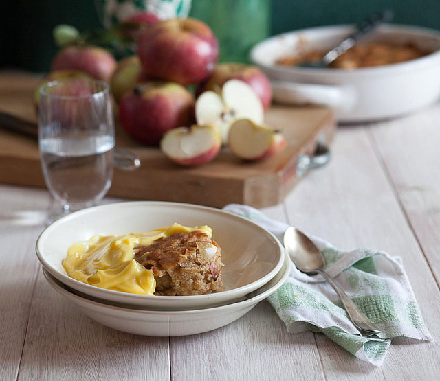 Espalhe então a massa numa forma redonda, sem buraco, com cerca de 20cm de diâmetro, e alise a superfície o melhor que puder. Misture o xarope de ácer com a água quente e deite por cima da massa. Leve rapidamente ao forno pré-aquecido a 180ºC. Deixe cozer cerca de 20-25 mnts, não deixe cozer em demasia pois este bolo é bom ainda macio. Sirva morno, tépido ou frio. Eu sugiro uma custarda para acompanhar, ou então uma bola de gelado ou natas batidas.