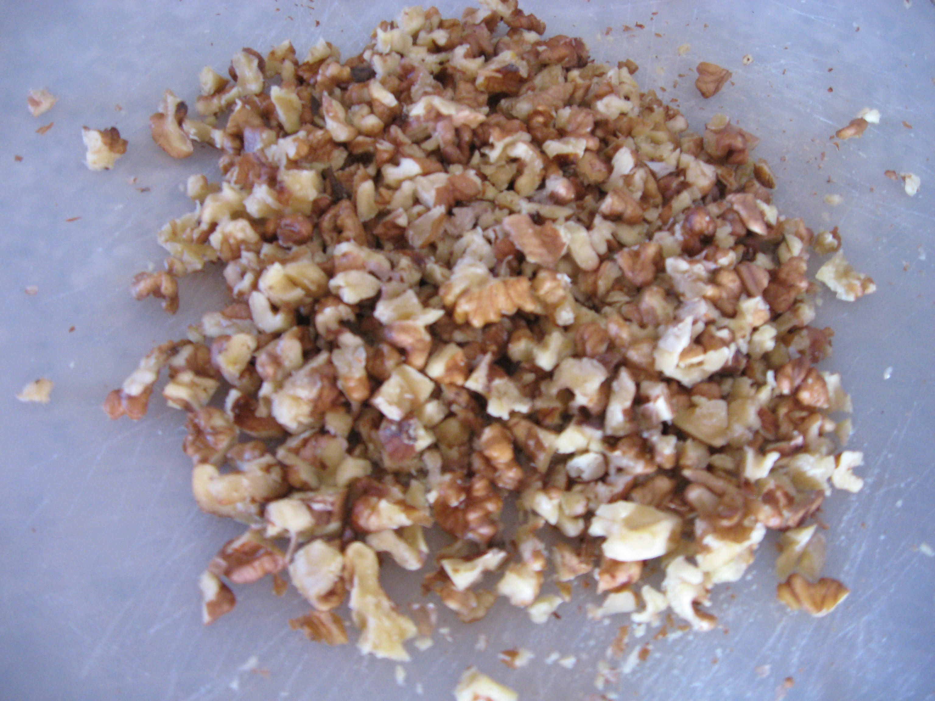 Cortar (prefiro com faca) as nozes em pedacinhos. Reservar