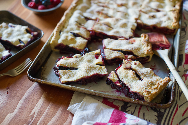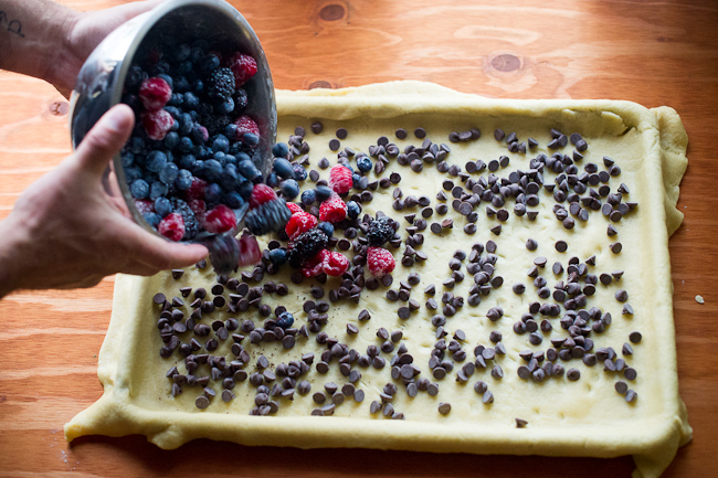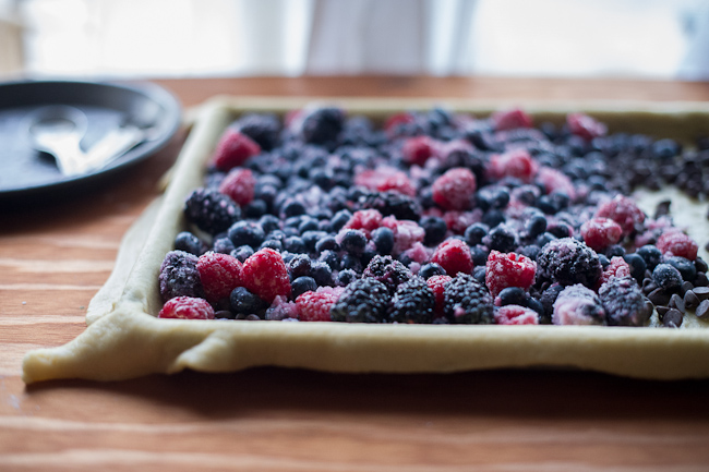 Deite as pepitas de chocolate e as bagas por cima da massa e espalhe bem. Reserve.