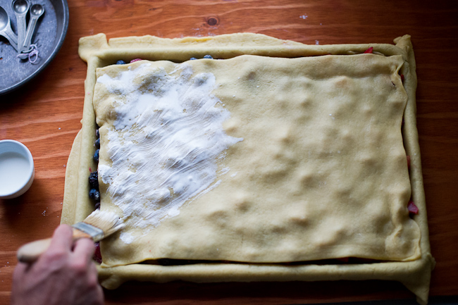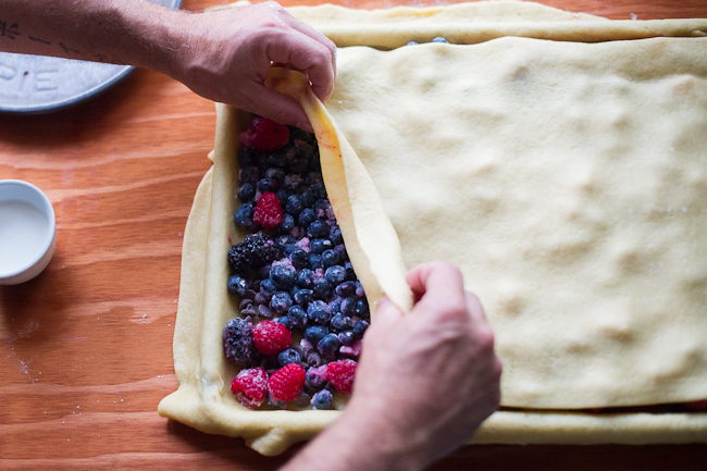 Pressione gentilmente as extremidades da massa contra o recheio e dobre a massa do fundo por cima da mesma, de forma a selar, pressionando a toda a volta com as pontas dos dedos. Barre com manteiga derretida e com a ajuda de uma faca afiada faça alguns cortes no topo.