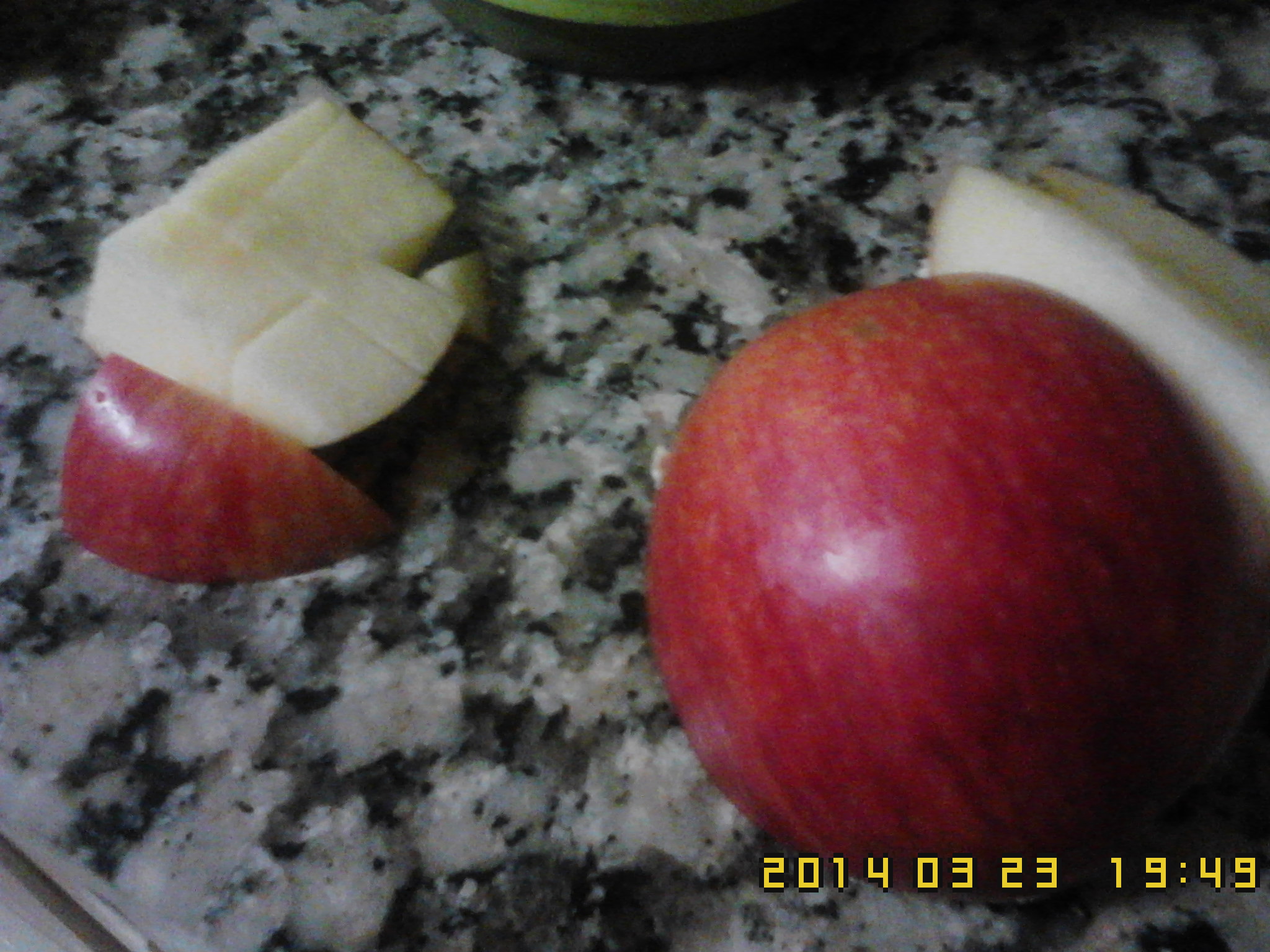 2) Junte, no copo, mel,maçã curtados aos bucados.2m-70C-V2 a 3.