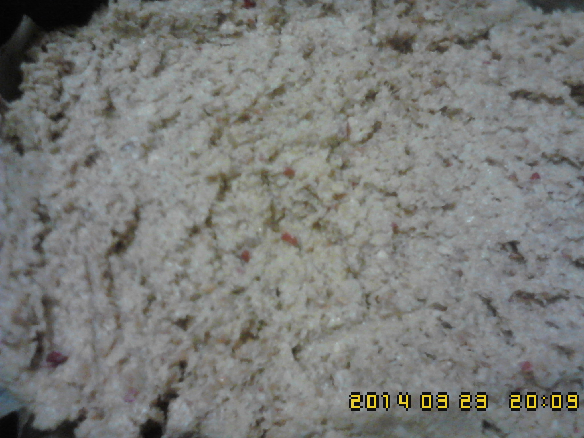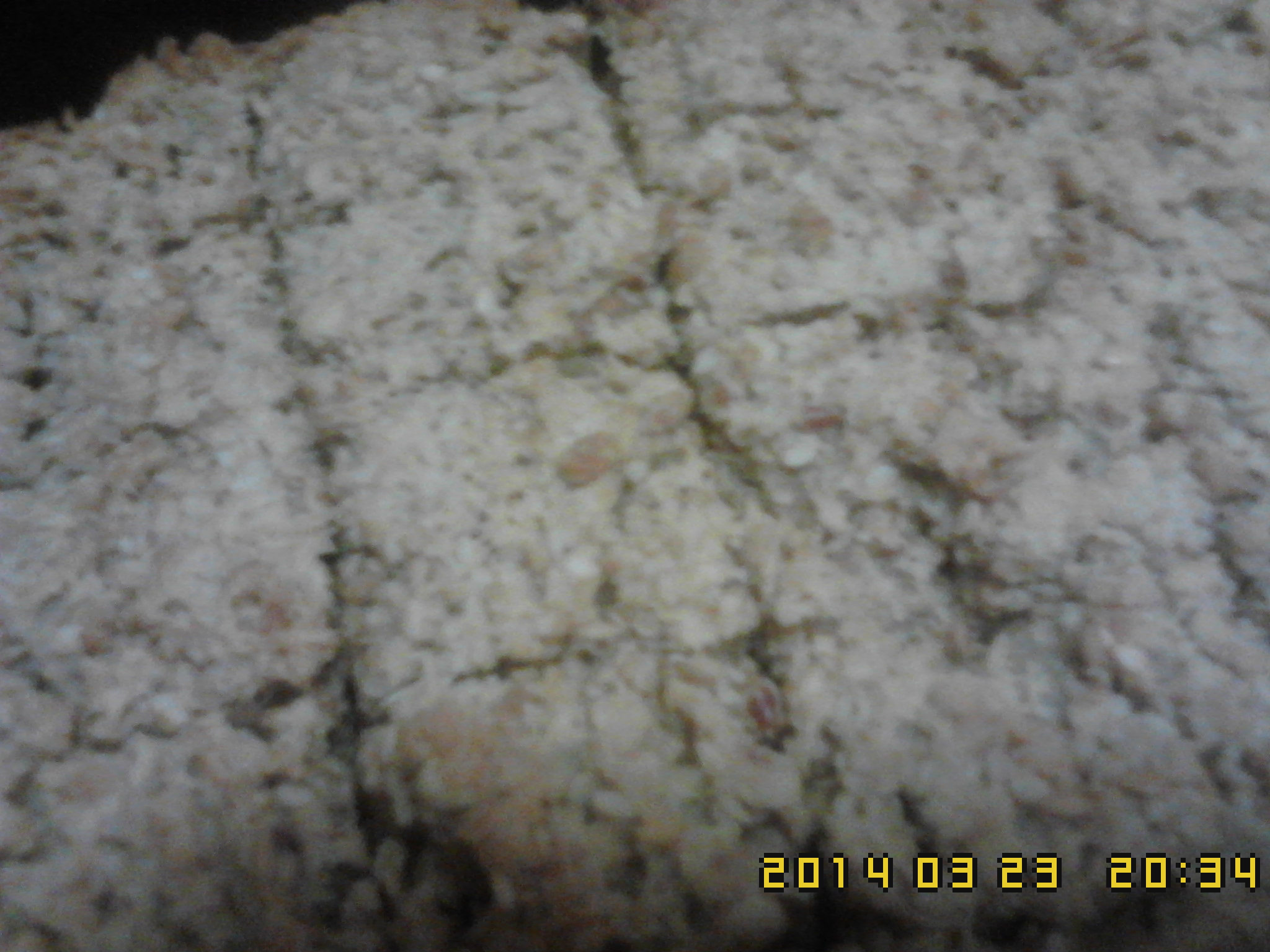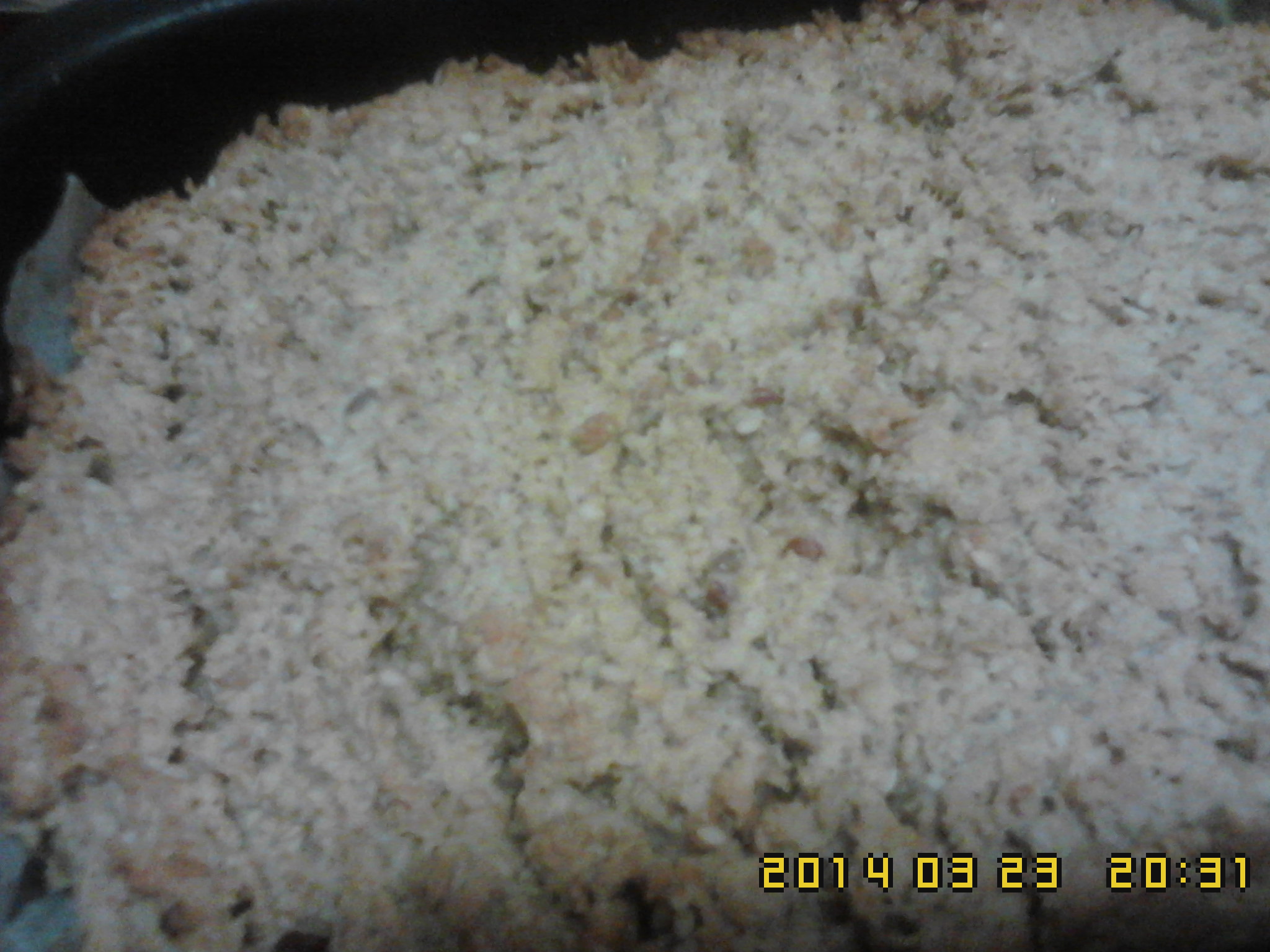 4) No tabuleiro,ponha o papel vegetal,coloque o preparado em cima do preparado,acerte com a espátula.Forno pré aquecimento 5m a 180C.A seguir ponha no forno o tabuleiro 15m a 20m-200C.