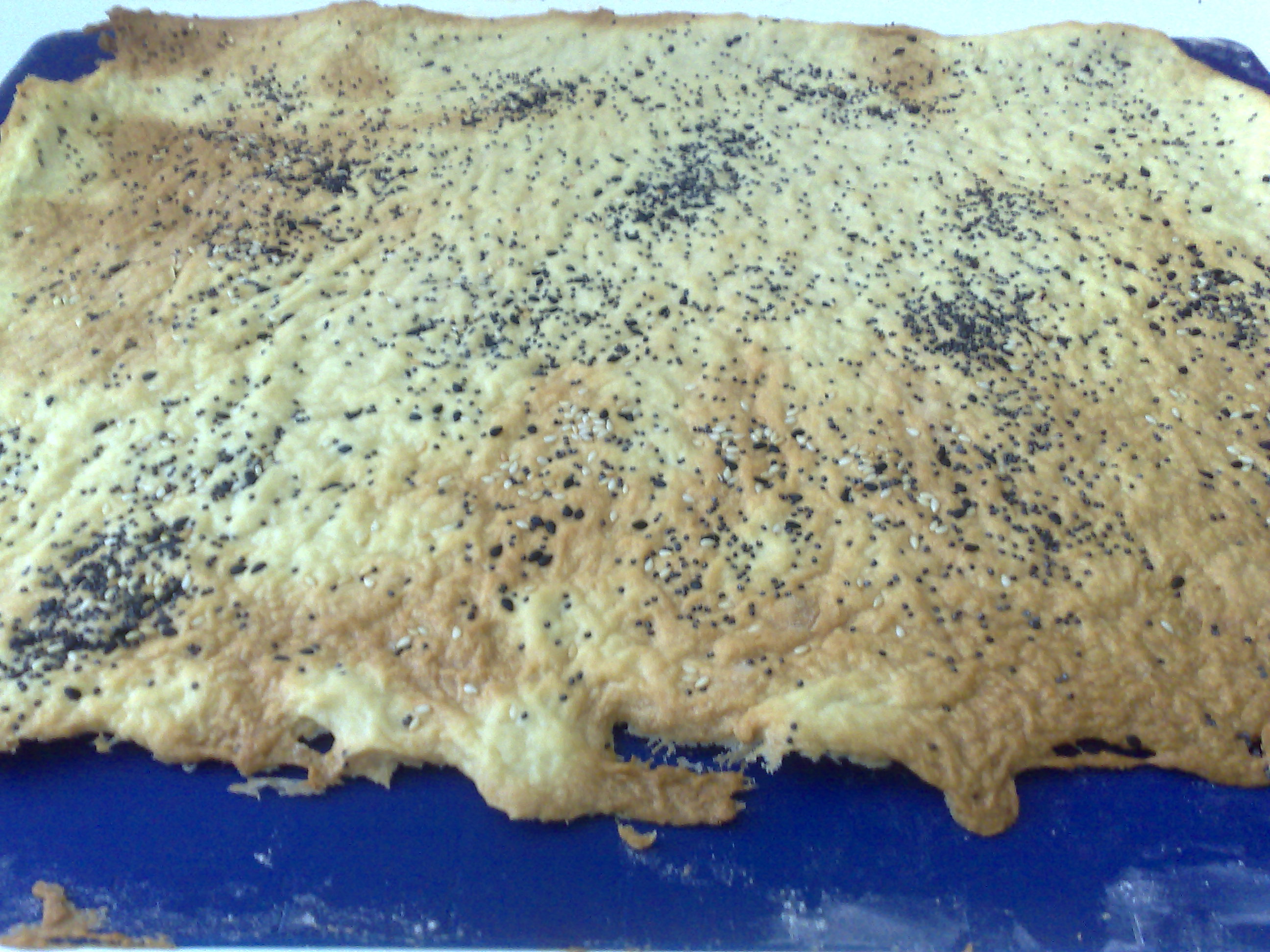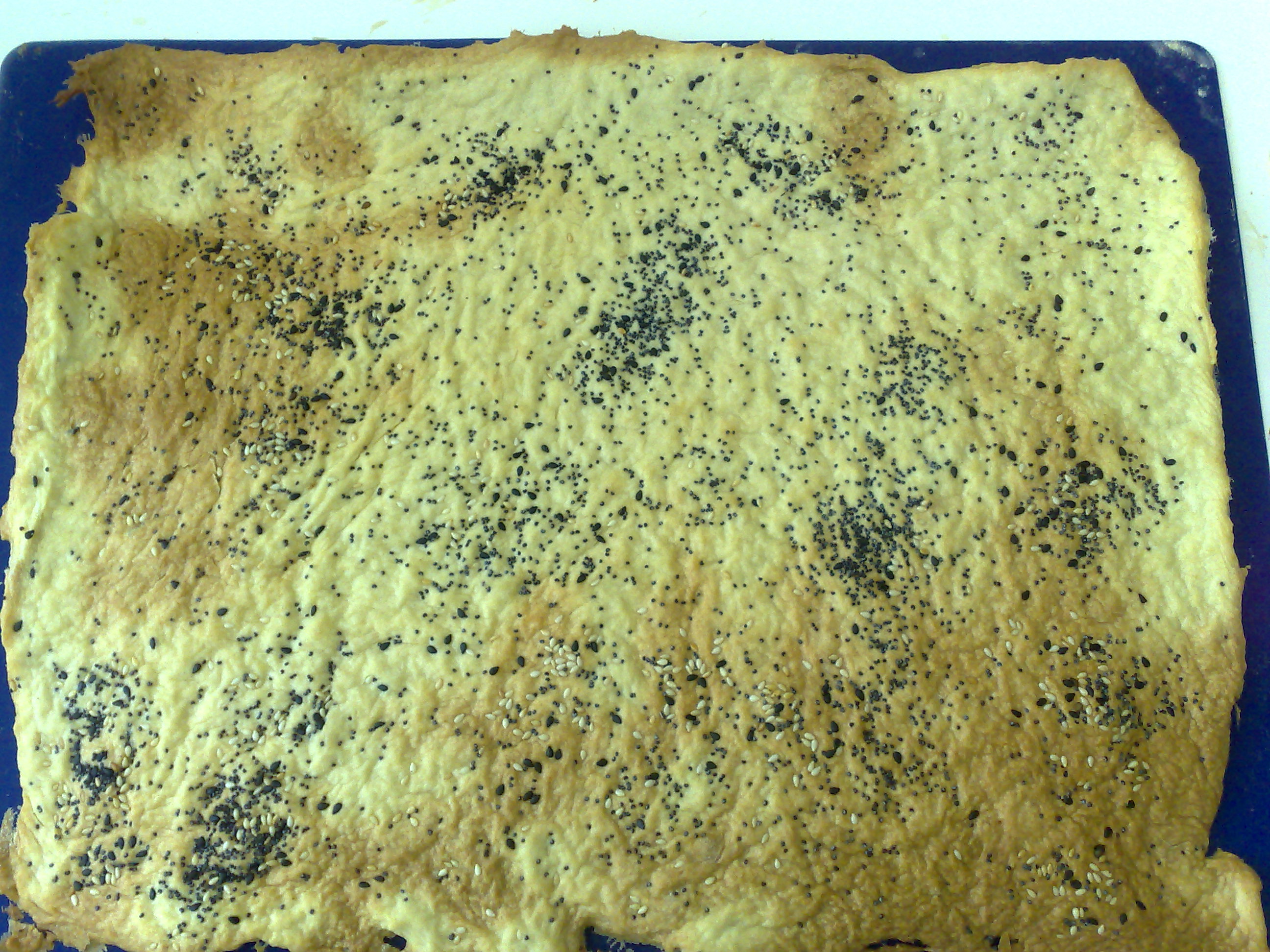 Experimentei mas não ficou muito bom... A massa estava muito pegajosa e para conseguir trabalhar meti mais farinha e voltei a amassar. No fim não sei se deixei a massa muito alta (acho que estava bom), mas sabia muito a farinha, apesar de ter colocado um pouco de queijo com as sementes.