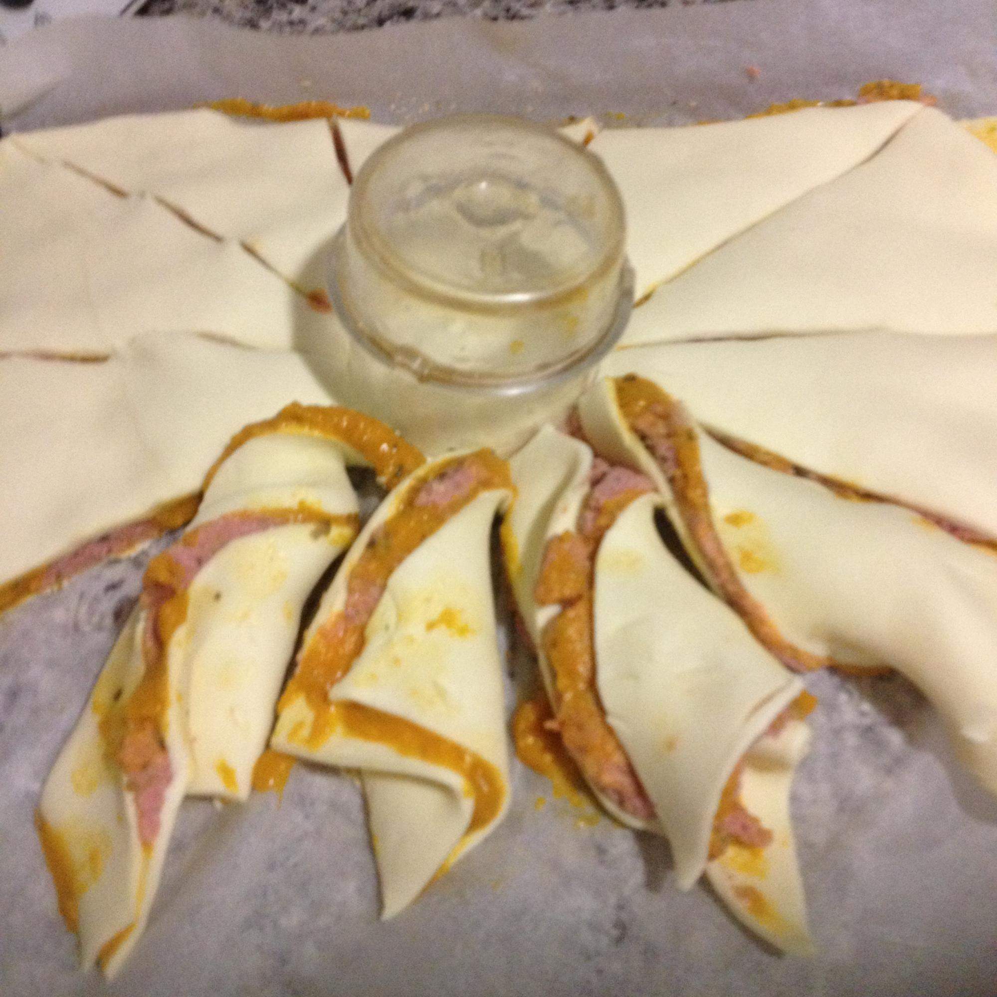 6. Partir a massa folhada ao meio (dobra-la e cortar mesmo ao meio). Metade da massa folhada cobrir com o molho polvilhar com oregãos e colocar o recheio.